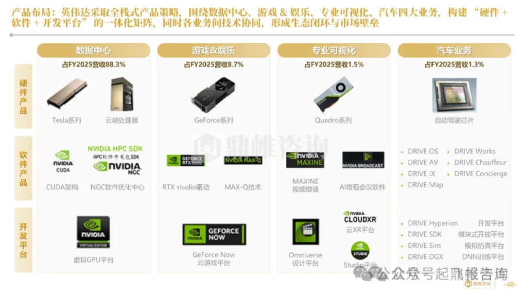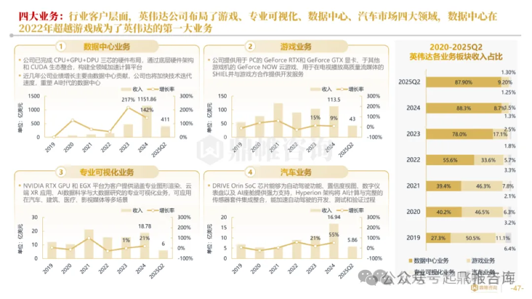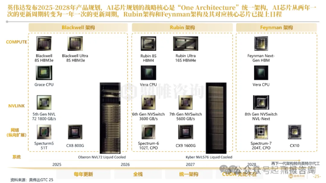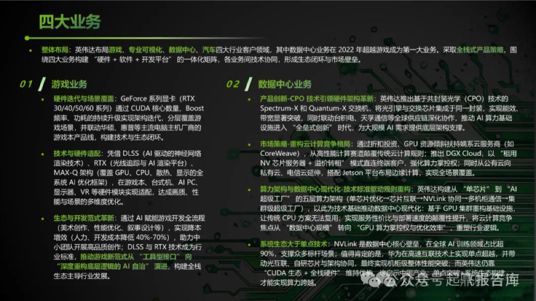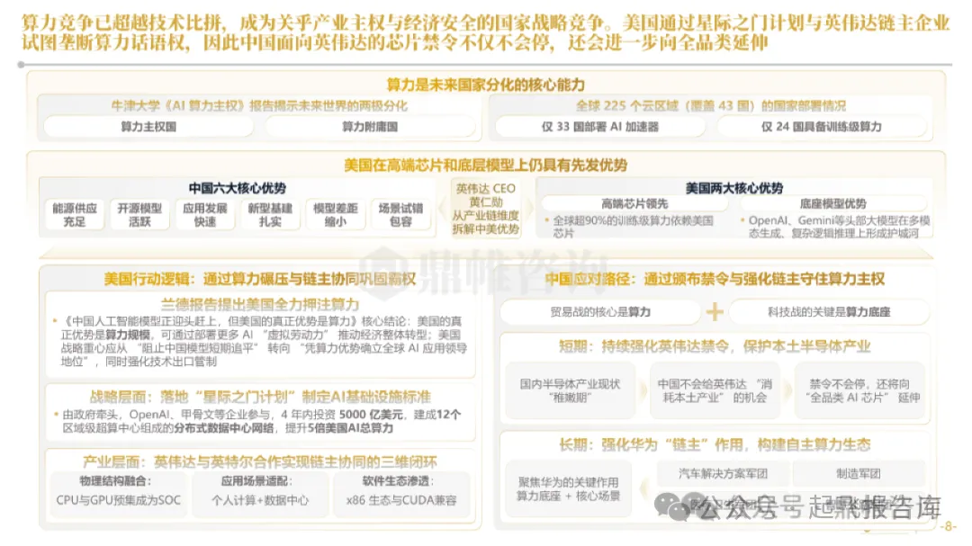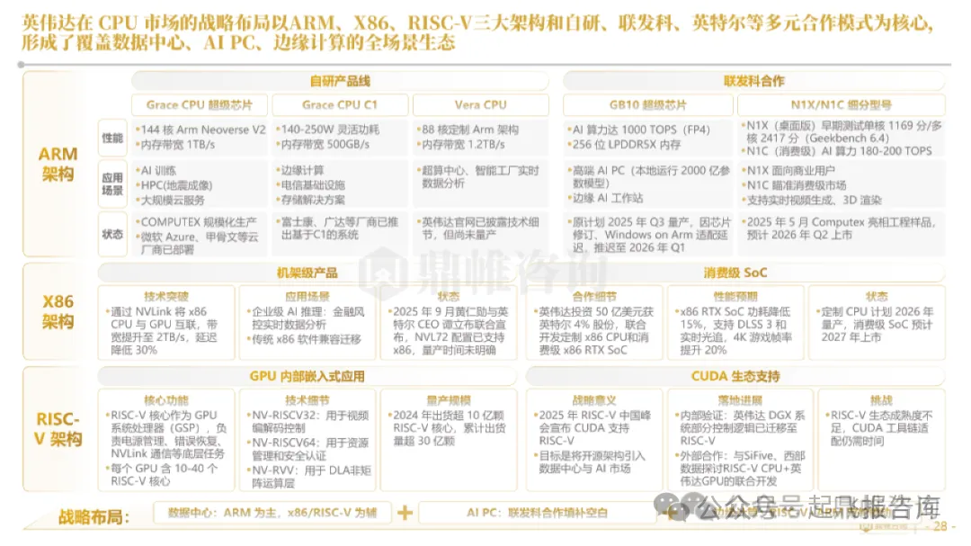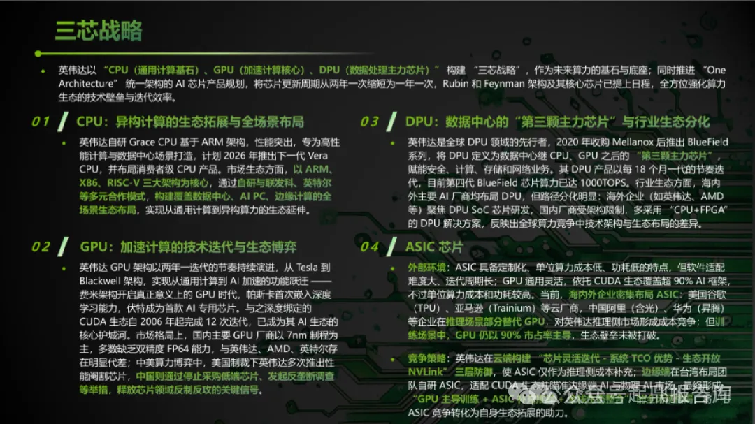 《人工智能发展战略研究报告(2025版)》由鼎唯战略创新研究院发布,聚焦英伟达在人工智能领域的战略布局与全球竞争态势。报告指出,英伟达已超越传统芯片企业身份,成为美国维系技术霸权的关键支点,其“三芯战略”(CPU、GPU、DPU)与“四大业务”(游戏、专业可视化、数据中心、汽车)构建了全栈AI基础设施体系。通过“星际之门”等国家级算力项目,美国正推动zettascale级AI算力网络建设,强化算力主权与生态控制。英伟达与OpenAI、甲骨文等形成ONO联盟,入股英特尔实现CPU-GPU深度融合,进一步巩固其在AI训练与推理市场的主导地位。报告同时剖析了中国在算力自主、芯片禁令、华为链主作用等方面的应对策略,强调中国AI产业在ASIC、边缘计算等领域的追赶态势与生态整合挑战。研究还覆盖英伟达在医疗、机器人、量子计算等第二曲线的布局,呈现其在物理AI、生成式世界模型等领域的前沿探索。