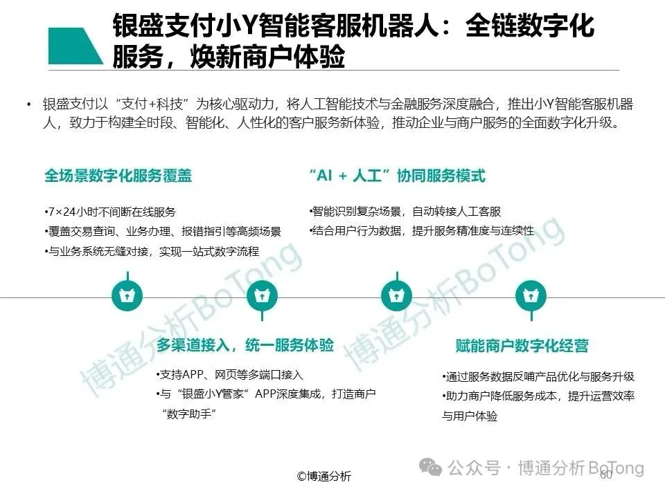 报告强调,AI是支付行业智能化转型的核心引擎。智能化服务是银盛支付的一大亮点:其推出的小Y智能客服机器人,实现7×24小时在线服务,覆盖交易查询、业务办理等高频场景;同时通过“AI+人工”协同模式提升服务精准度,有效提高运营效率。此外,该机器人与“银盛小Y管家”APP深度集成,成为商户的“数字助手”。这一服务不仅降低了商户的运营成本,更通过数据反哺推动产品优化,形成“服务-数据-升级”的闭环。