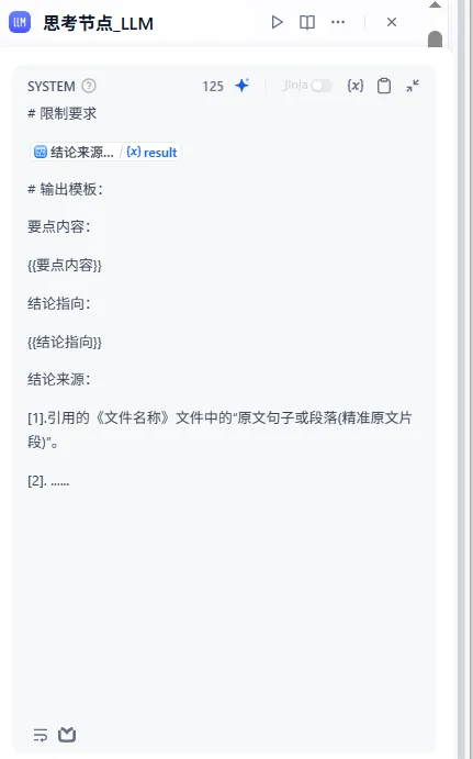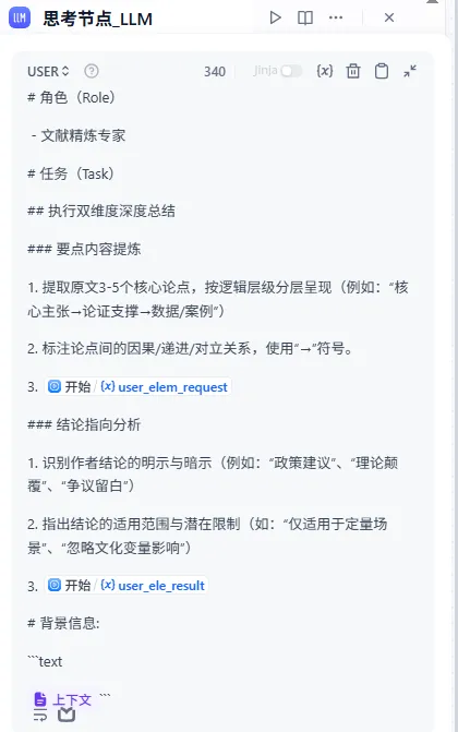 处理节点(LLM思考节点):应用定制提示词,执行总结任务。