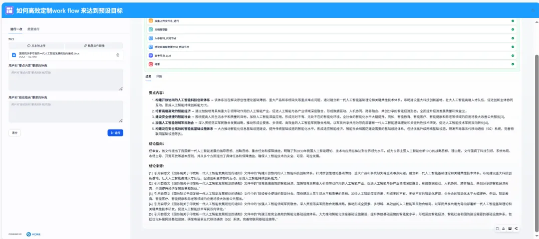 为体现专业性,我们选用一份AI政策文件作为示例(来源:中国《新一代人工智能发展规划》通知)。案例展示如何用汇见AI定制工作流,自动提取关键信息并溯源——这对AI开发者处理海量文档极具价值。