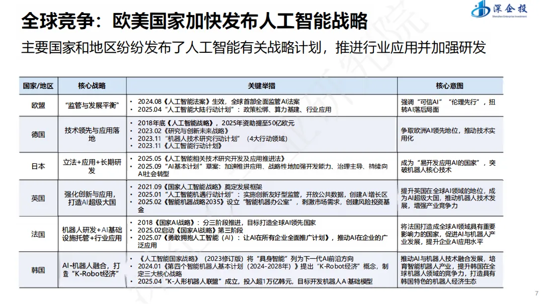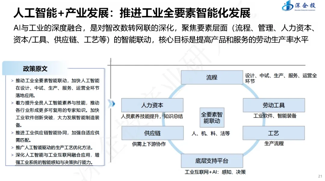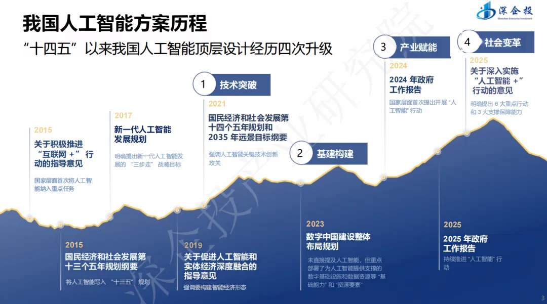 随着人工智能技术进入大规模应用的关键窗口期,全球各国正加速布局AI发展战略,力图在新一轮科技竞争中占据先机。2025年,我国正式提出“人工智能+”行动,标志着人工智能发展从技术突破阶段迈向与经济社会深度融合的新时期。其旨在系统解读国家政策导向、梳理产业发展脉络、揭示市场机遇方向,为各级政府、企业和投资者提供决策参考。