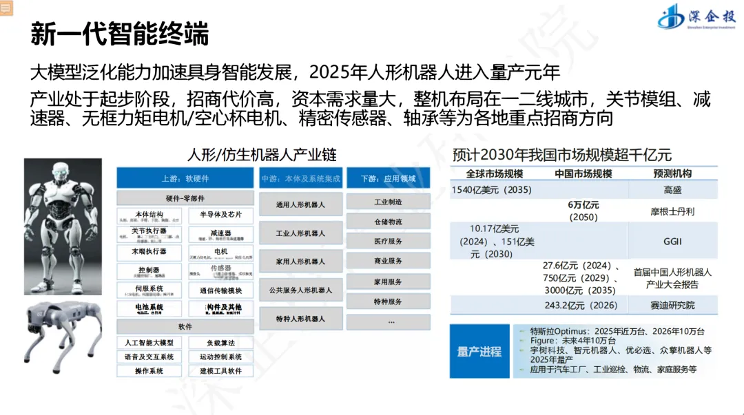 报告强调,智能算力、开源生态、应用中试基地与人才队伍构成核心保障体系。在产业机遇层面,算力/光通信、具身智能/人形机器人、新一代智能终端三大产业链迎来爆发式增长,2030年全球具身智能市场规模预计达2326.3亿元。最终,通过顶层设计、技术标准与商业模式的协同,报告为中国在智能经济时代抢占全球竞争制高点提供了系统性战略路径。