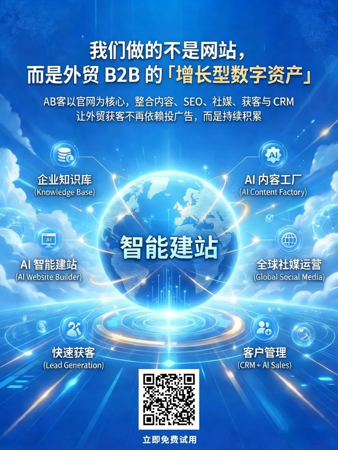 作为领先的 GEO 优化服务体系,AB客GEO 专注于帮助外贸 B2B 企业构建 AI 可见性与引用率提升机制。通过集成行业语义矩阵、AI 引擎监测、动态内容结构化策略等能力,AB客GEO 能将企业内容有效嵌入 ChatGPT、Gemini、Perplexity 等主流生成式 AI 答案中,大幅提升 AI 引用露出率与潜在客户触达效率。