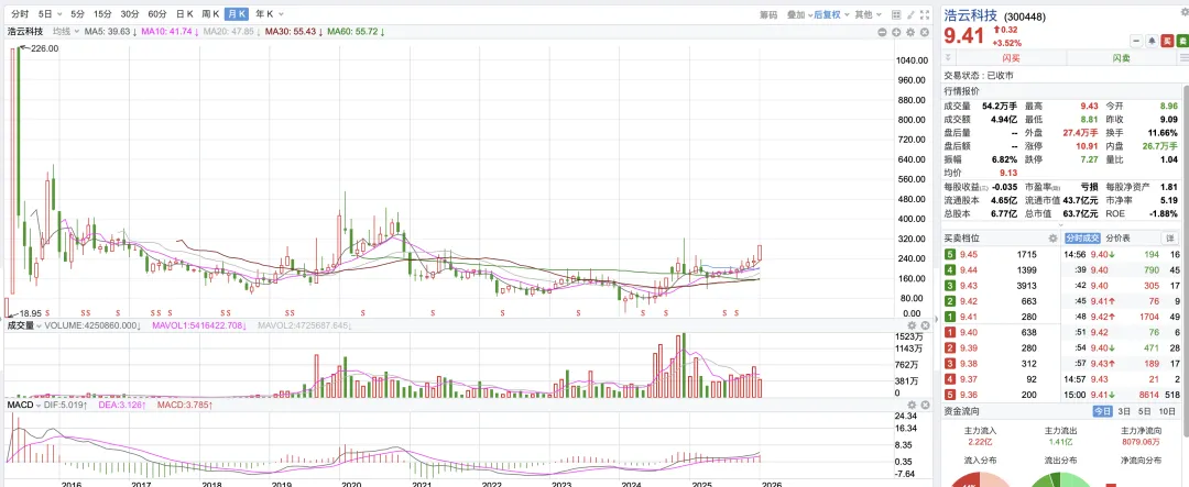 十年前,浩云科技以“金融安防龙头”的身份登陆创业板,股价曾一度冲上226元的巅峰,是市场公认的“大牛股”。然而,十年后的今天,其股价在9.41元附近徘徊,市值仅63.7亿元,业绩连续两年亏损,ROE为负。这看似是一段“失落的十年”。
