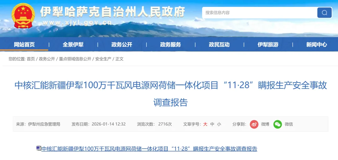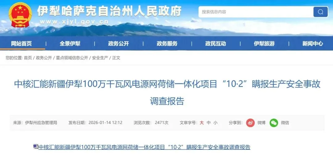近日,新疆维吾尔自治区伊犁哈萨克自治州人民政府网站公布2起事故调查报告,分别为《中核汇能新疆伊犁100万千瓦风电源网荷储一体化项目“10·2”瞒报事故调查报告》和《中核汇能新疆伊犁100万千瓦风电源网荷储一体化项目“11·28”瞒报生产安全事故调查报告》。
