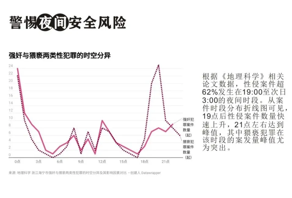 根据《地理科学》相关调研数据显示,性侵犯罪的发生时间呈现明显的夜间聚集性:19点至次日3点是案发高峰,其中21点更是风险峰值时段。夜晚的视线盲区、人员流动性降低,成为犯罪滋生的温床。