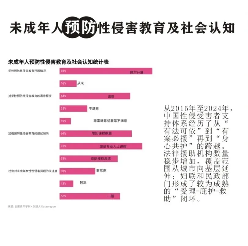 从2018至2024年的调研数据来看,我国未成年人预防性侵教育的普及度仍有较大提升空间:近60%的未成年人未接受过系统的防性侵知识普及,农村地区的教育覆盖缺口尤为明显。加强校园与家庭的双重教育,是保护未成年人的关键。