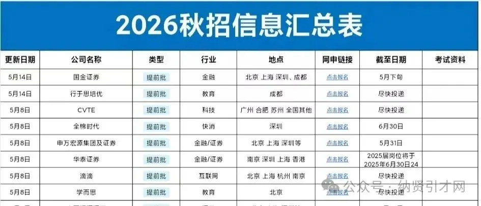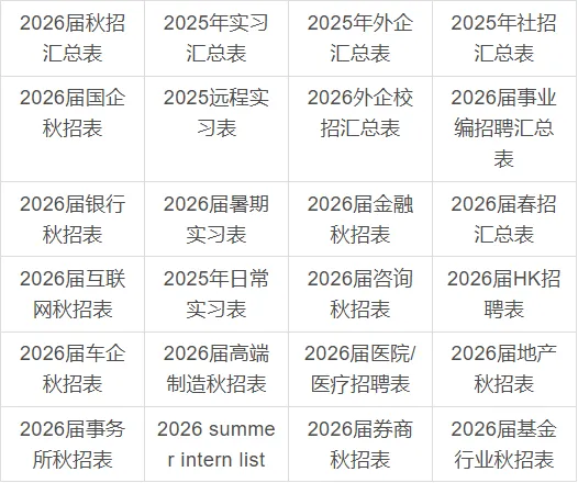 2025-2026年度会员将获得25个+招聘汇总表权益,每个表格将持续更新到周期结束 覆盖行业全面:银行/证券/基金/保险/期货/互联网/电子商务/计算机软件/通信/国家机关/高校/研究所/事业单位 /教育/会计师事务所/咨询公司/法律/消费品/零售/服装/家具/贸易/制造业/汽车/电子/电器/机械/石油/钢铁/电力/能源/煤矿/化工/生物/制药/医疗/农林/畜牧/媒体/广告/旅游/公关/文化/影视/酒店......... 同时还有企业性质细分,包含国企、民企、外企等。 个性化筛选:所有信息均支持自主筛选,行业-企业-截止时间-投递链接-工作地点…,分门别类,一目了然,既能海投,又能精准投递。 每周校招截止提醒⏰:每周截止校招专属提醒,不错过任何一个机会! 信息差,是影响大部分同学就业的关键因素! 上一届校招(秋招+春招)期间, 共计汇总企业10000+ 订阅人数10000+ 包括国央企、事业单位、民企、外企、合资企业......。