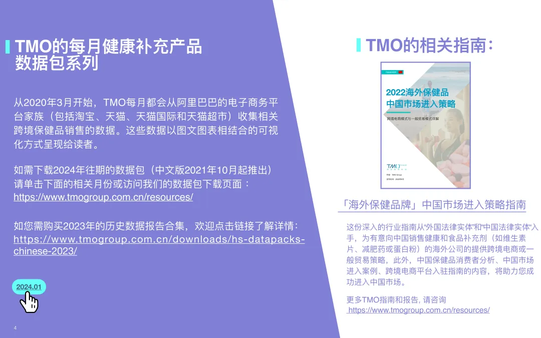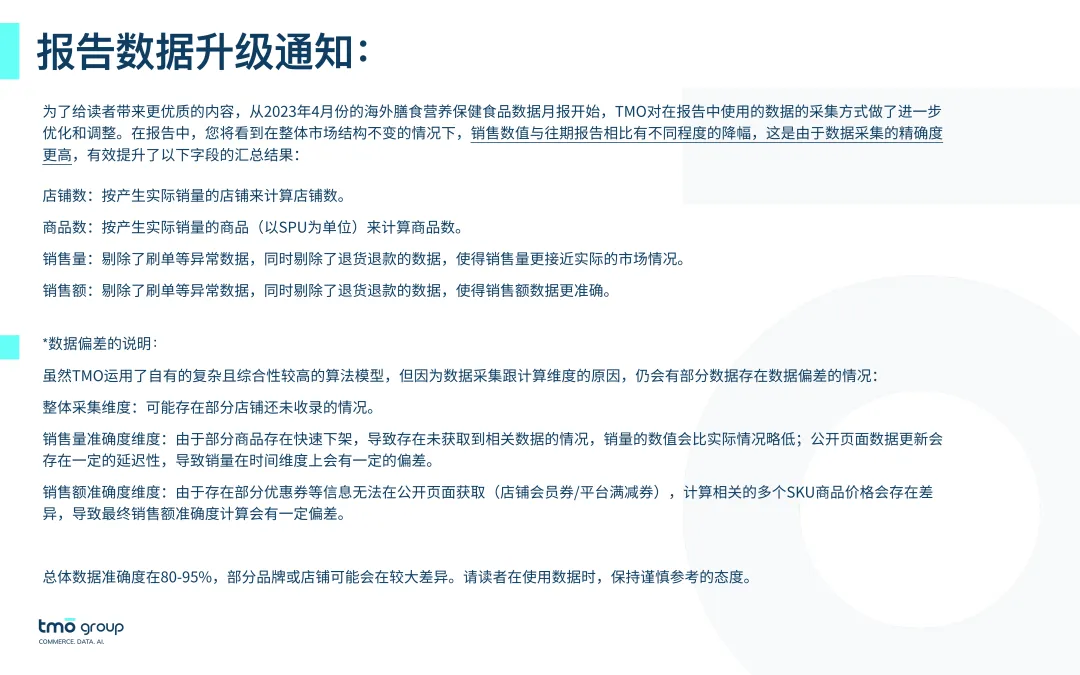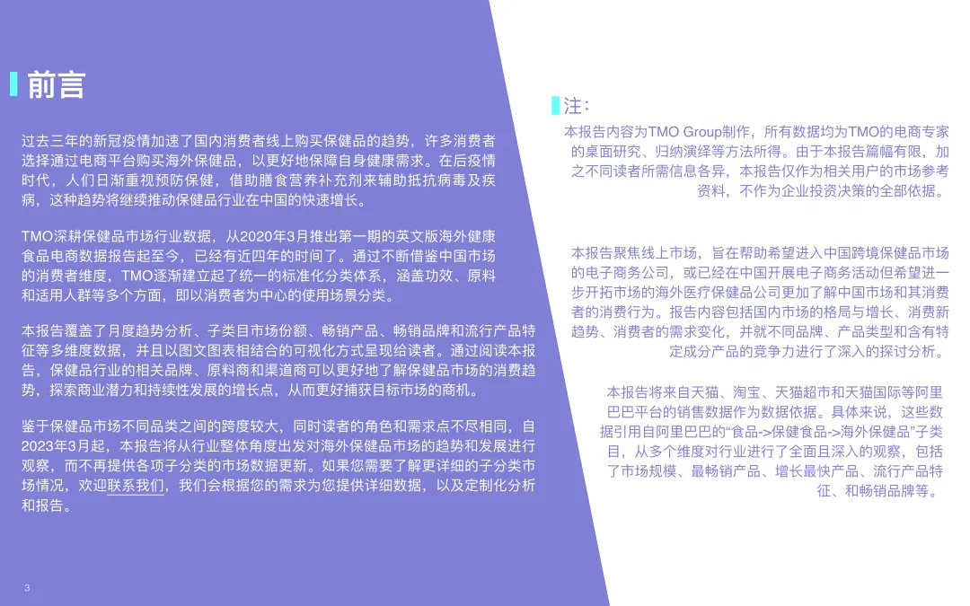 TMO深耕保健品市场行业数据,从2020年3月推出第一期的英文版海外健康食品电商数据报告起至今,已经有近四年的时间了。通过不断借鉴中国市场的消费者维度,TMO逐渐建立起了统一的标准化分类体系,涵盖功效、原料和适用人群等多个方面,即以消费者为中心的使用场景分类。