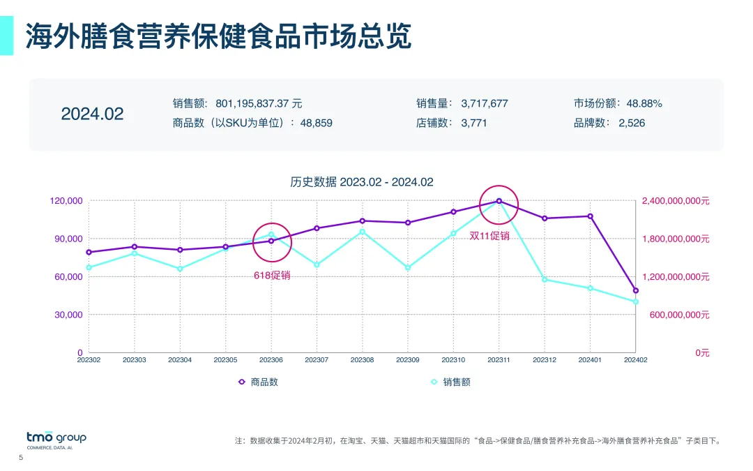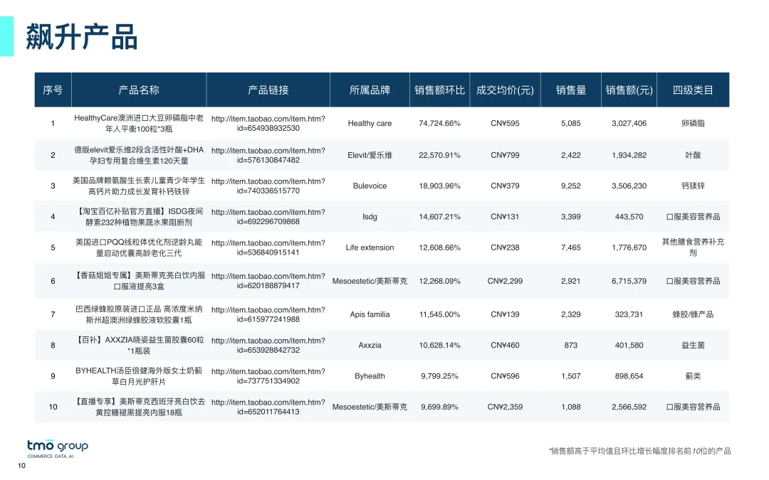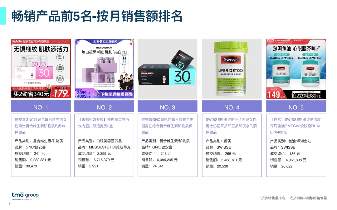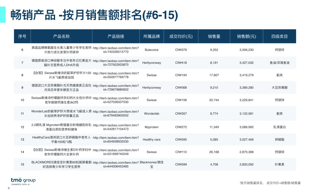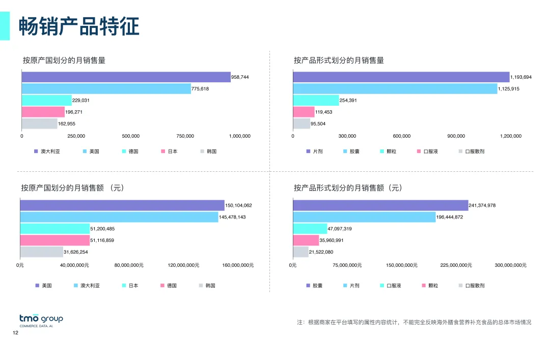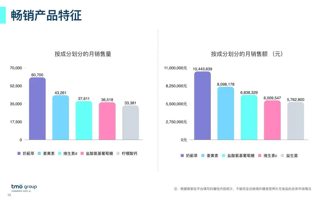 本报告覆盖了月度趋势分析、子类目市场份额、畅销产品、畅销品牌和流行产品特征等多维度数据,并且以图文图表相结合的可视化方式呈现给读者。通过阅读本报告,保健品行业的相关品牌、原料商和渠道商可以更好地了解保健品市场的消费趋势,探索商业潜力和持续性发展的增长点,从而更好捕获目标市场的商机。
