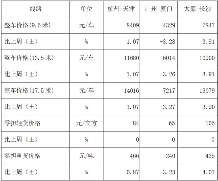 表1 本周部分线路平均价格及环比情况对比