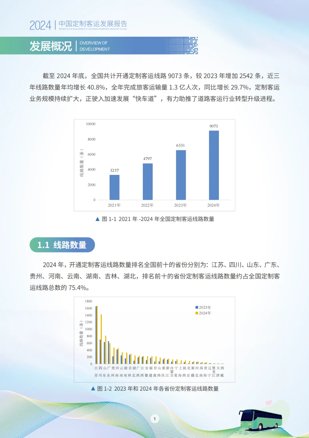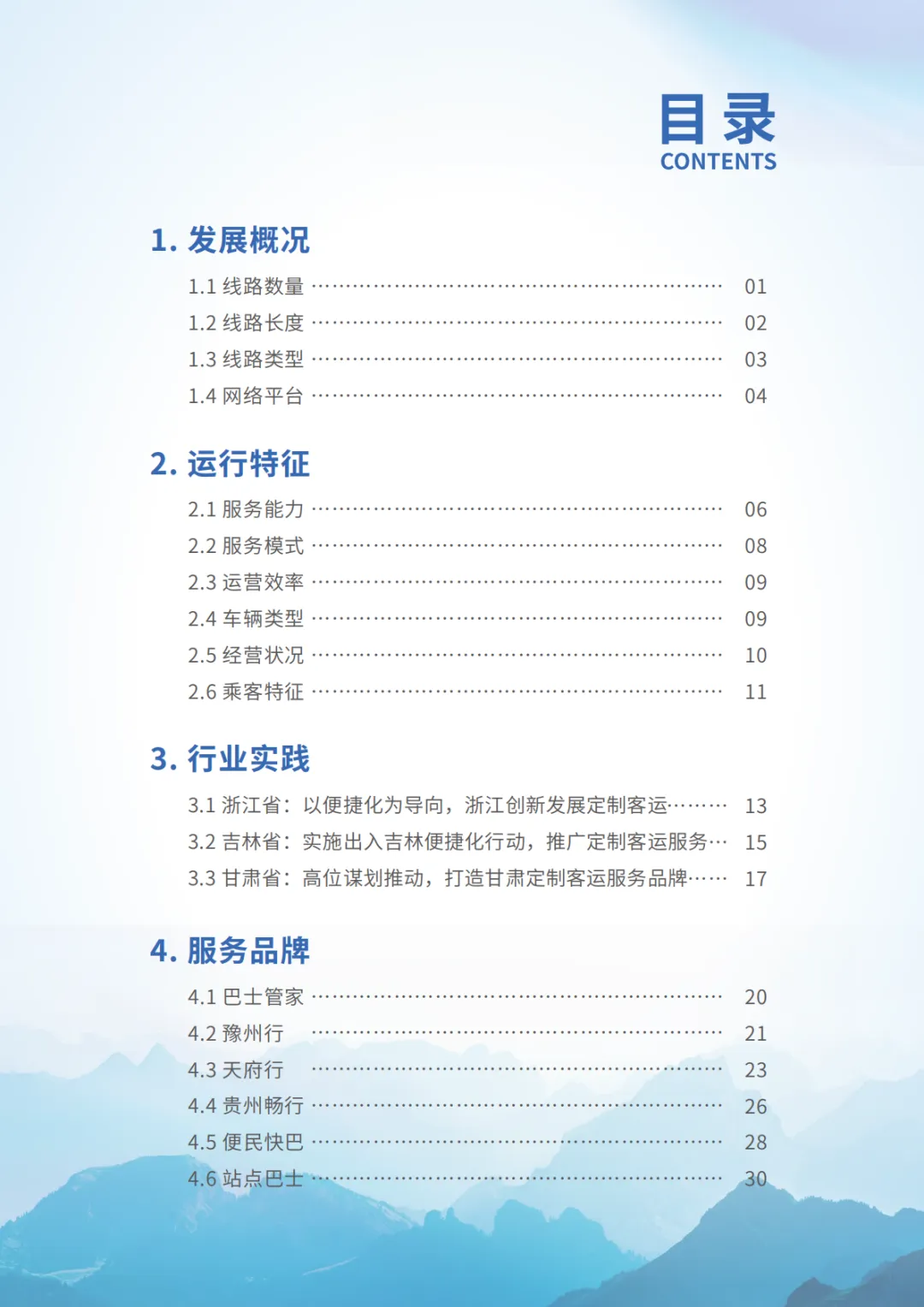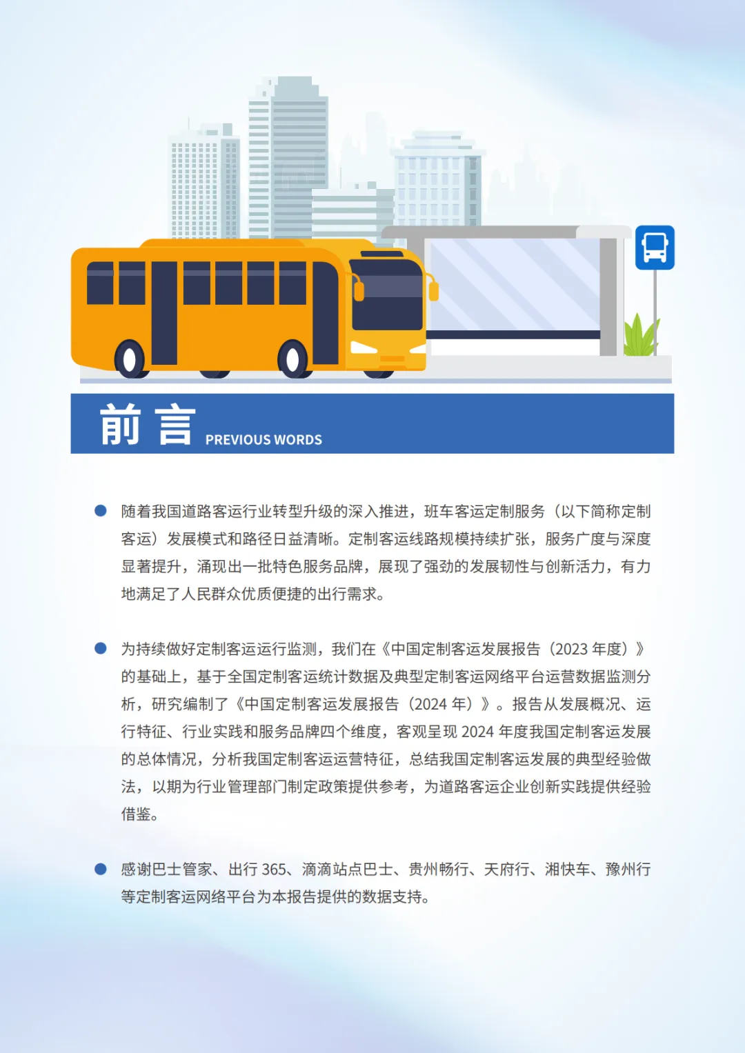 ● 为持续做好定制客运运行监测,我们在《中国定制客运发展报告(2023 年度)》的基础上,基于全国定制客运统计数据及典型定制客运网络平台运营数据监测分析,研究编制了《中国定制客运发展报告(2024 年)》。报告从发展概况、运行特征、行业实践和服务品牌四个维度,客观呈现 2024 年度我国定制客运发展的总体情况,分析我国定制客运运营特征,总结我国定制客运发展的典型经验做法,以期为行业管理部门制定政策提供参考,为道路客运企业创新实践提供经验借鉴。