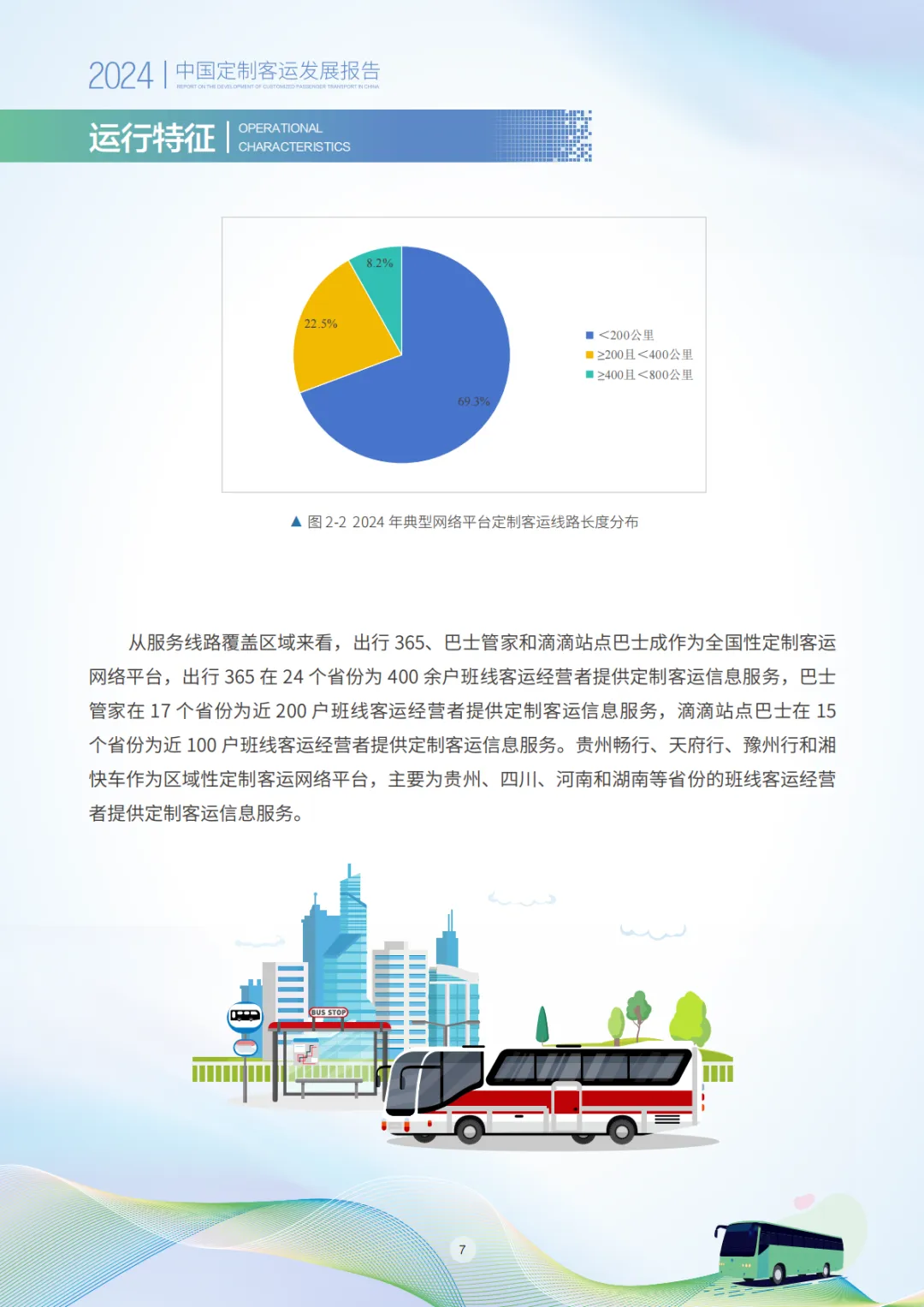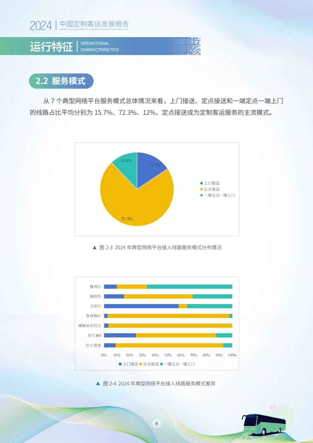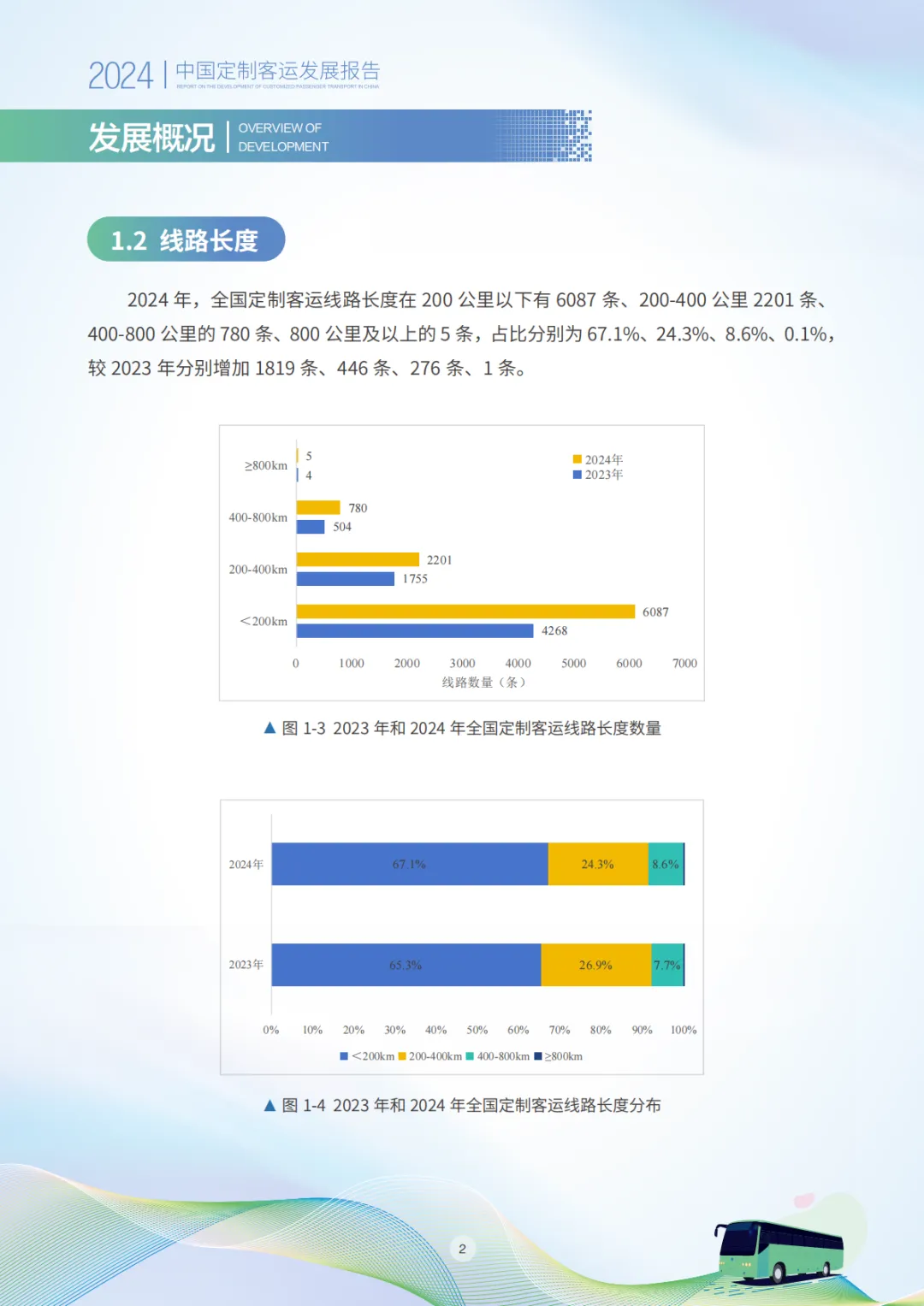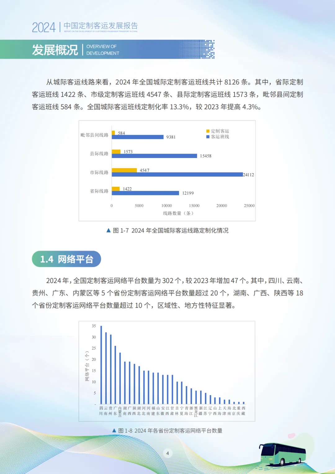 ● 为持续做好定制客运运行监测,我们在《中国定制客运发展报告(2023 年度)》的基础上,基于全国定制客运统计数据及典型定制客运网络平台运营数据监测分析,研究编制了《中国定制客运发展报告(2024 年)》。报告从发展概况、运行特征、行业实践和服务品牌四个维度,客观呈现 2024 年度我国定制客运发展的总体情况,分析我国定制客运运营特征,总结我国定制客运发展的典型经验做法,以期为行业管理部门制定政策提供参考,为道路客运企业创新实践提供经验借鉴。