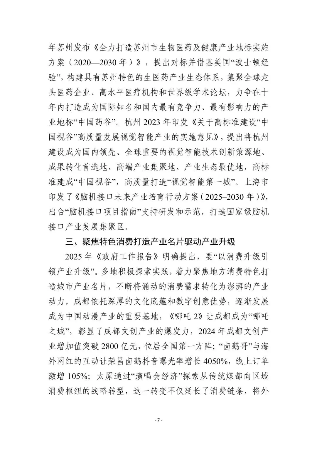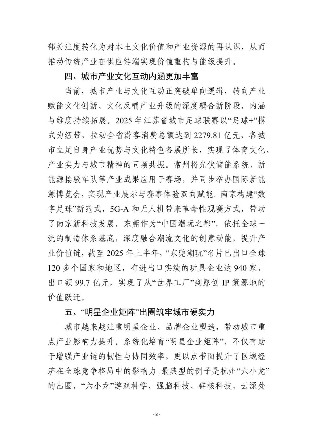 全球城市深化产业科技文化融合:文化科技深度融合成为产业升级的“新土壤”,如波士顿、底特律等地的创新案例。 先行城市塑造科创形象抢占新赛道:上海、杭州、苏州等地通过人工智能、低空经济等科创名片抢占先机。 特色消费驱动产业升级:成都等城市聚焦地方文化和消费特色,将消费需求转化为产业动力。 产业文化互动内涵丰富:产业赋能文化创新与文化反哺产业升级的双向逻辑增强,如常州打造文旅+产业双IP。 明星企业矩阵筑牢城市硬实力:杭州“六小龙”等企业品牌集体“出圈”,提升城市全球竞争力。 制造业区域品牌升级:区域品牌从地名标识升级为品质、技术、信誉和文化的综合载体。