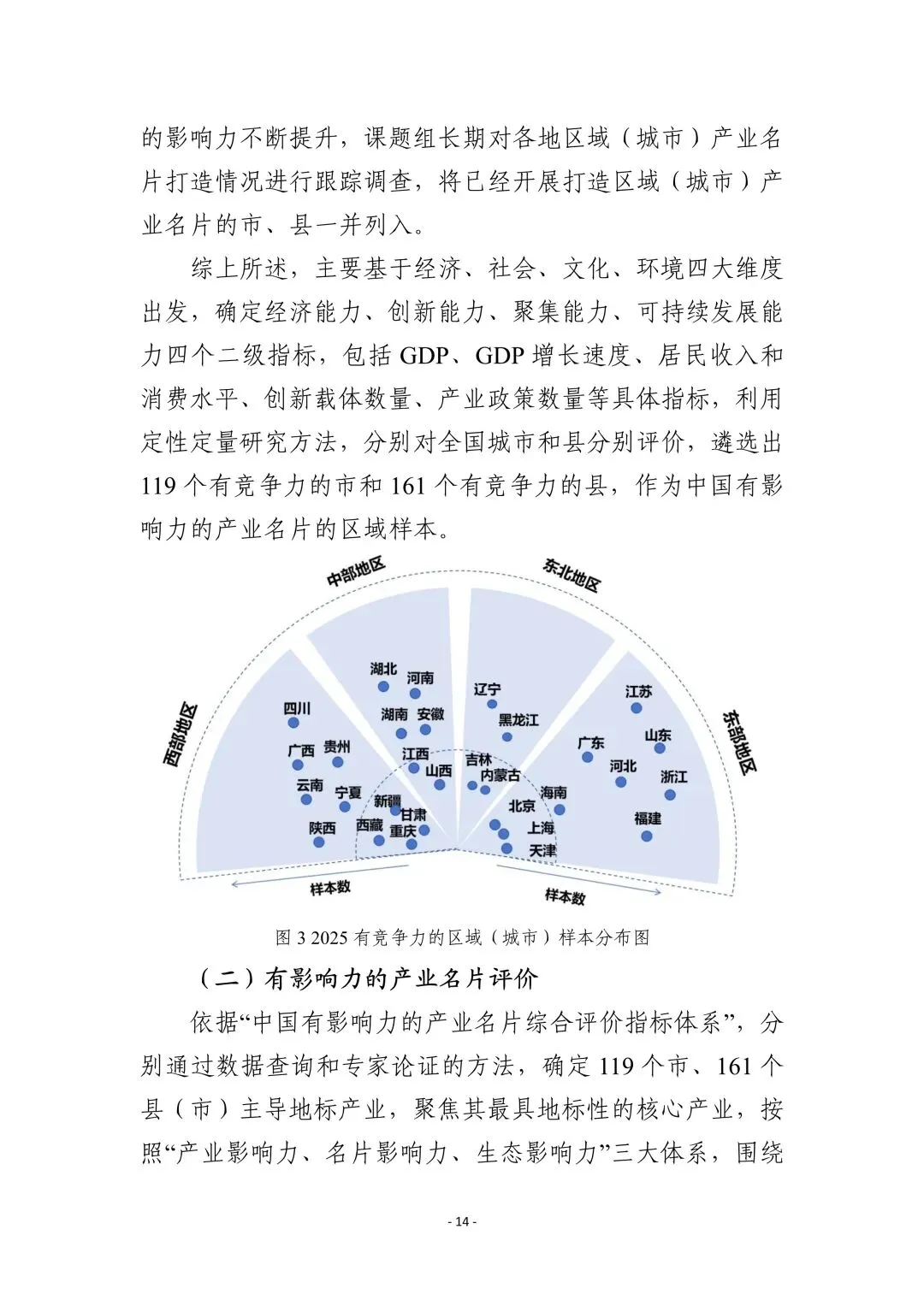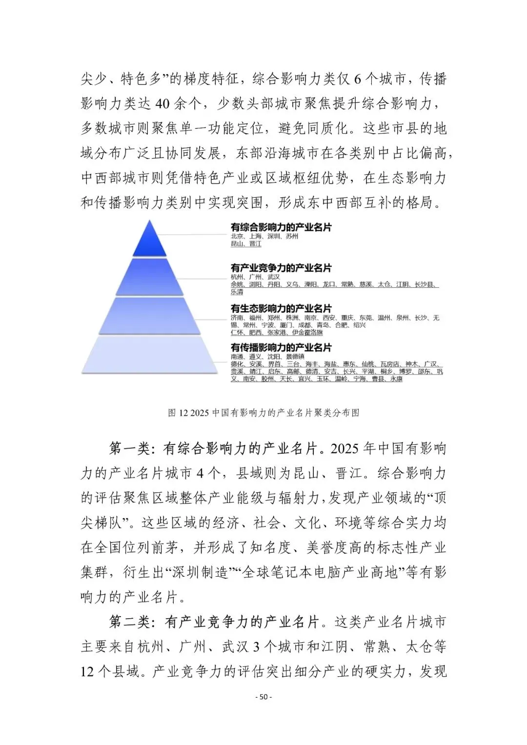 产业分布:电子信息类产业名片占比最高(28%),轻工纺织、装备制造、材料与能源化工类紧随其后,热点产业集聚与传统产业焕新并存。 类型划分:分为综合影响力、产业竞争力、生态影响力、传播影响力四类,东部沿海三大湾区构成核心格局,中西部中心城市在特定领域形成单点突破。