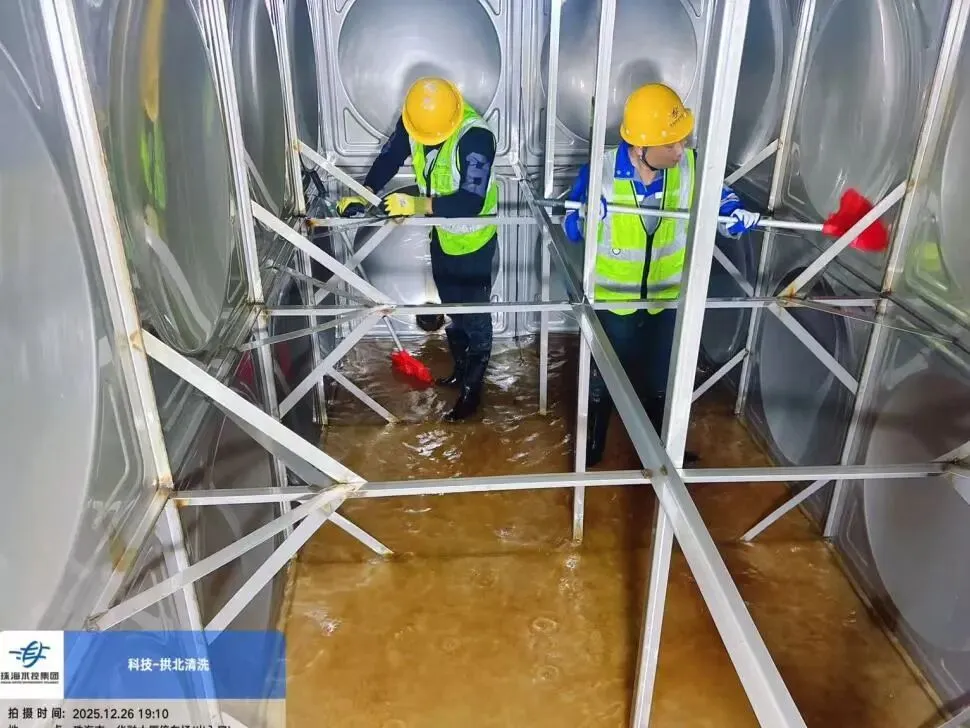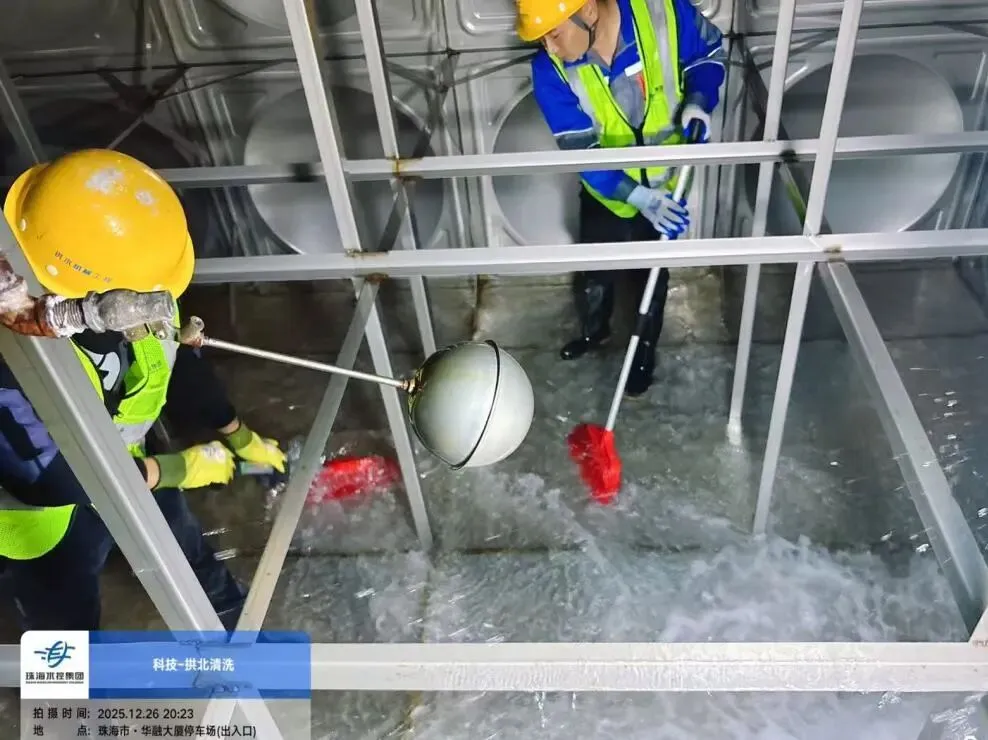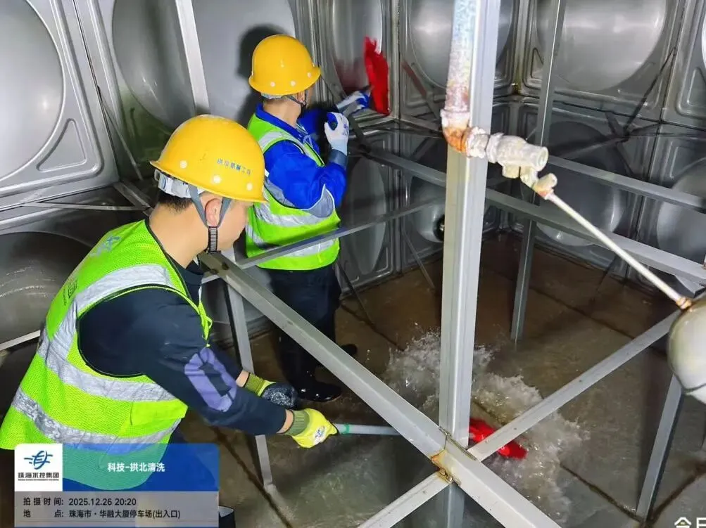 为保证生活用水安全,2025年12月26日由专业清洗人员对大厦水箱进行清洗,去除沉积物和污垢,保障水质安全。