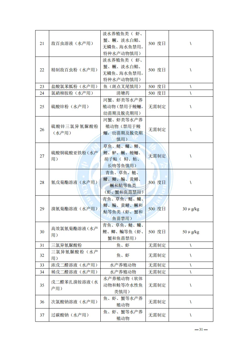 化学药品 | 盐酸氯苯胍粉、硫酸锌三氯异氰脲酸粉等 |