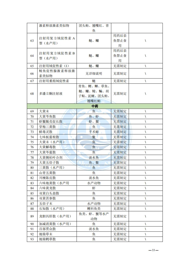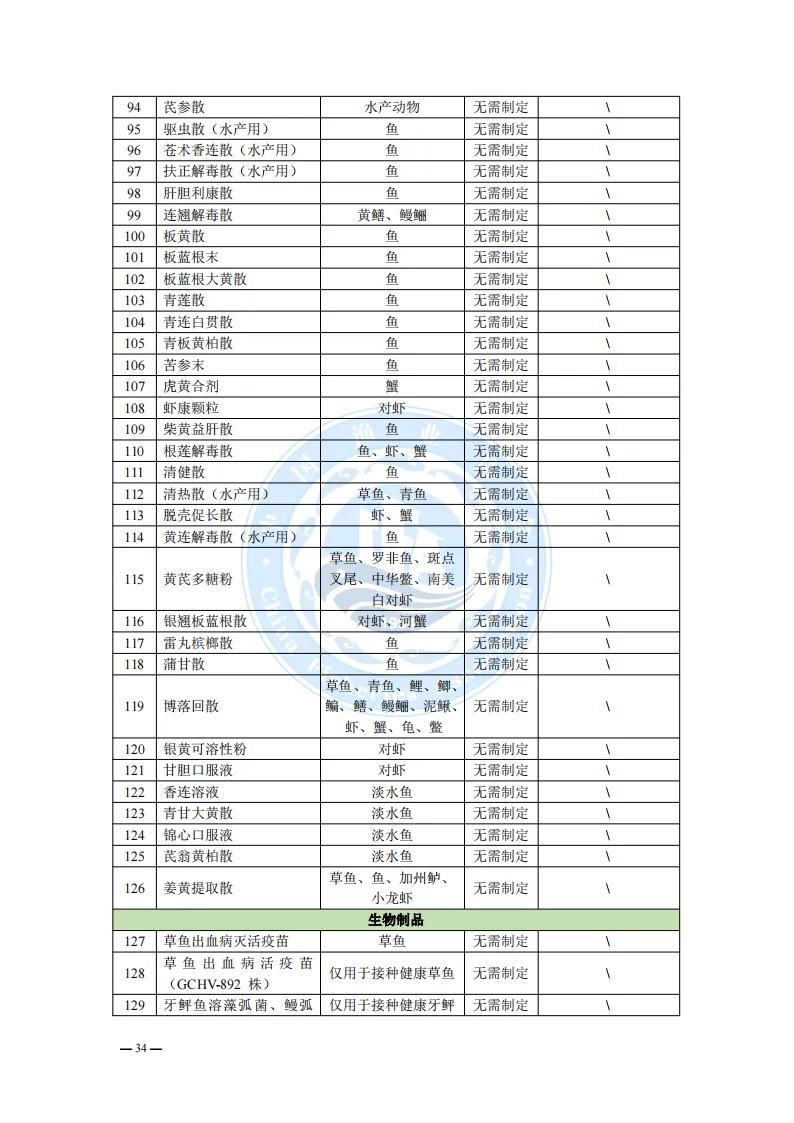 遵循《兽药管理条例》分类标准,与兽药类别保持一致,具体分为11大类(见表1)。目前经农业农村部批准使用的国标渔药有133个,其中化药(含抗生素、消毒剂、杀虫剂、激素等)68个,中药58个,生物制品(全部为疫苗)7个。见附件1。
