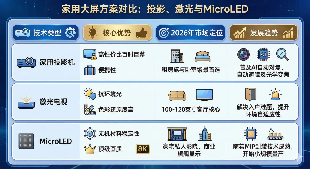 在家庭院线场景下,显示方案正向“巨幕化”与“护眼化”演进,与传统电视面板形成互补或替代关系。