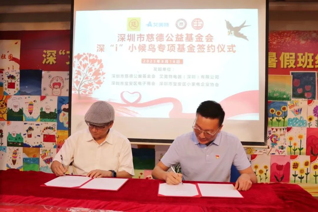 在第14届暑假班结课典礼上,深圳市慈德公益基金会与艾美特举行了简单而隆重的合作意向签约仪式,双方共同发起成立深“i”小候鸟专项基金,未来将通过基金会专业运作,让艾美特拥有14年的党政企校名牌老牌服务项目迈向品牌化、专业化,同时搭建名企与企业、商协会之间的交流合作平台。