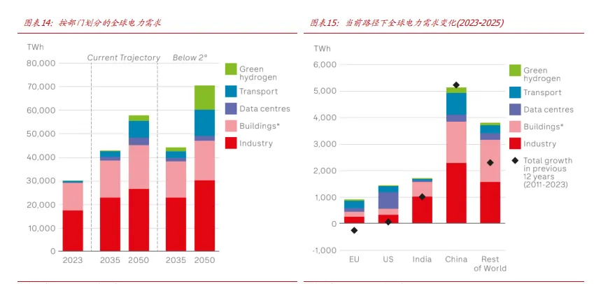 数据中心成为全球用电需求增长的新引擎。 根据 BP《能源望望 2025》报告,BP 观点认为,根据“当前轨迹”情景预测,到 2035 年全球电力需求量将突破 40 万亿瓦时,较 2023年增长超 40%。新增电力需求主要来源于两大新兴部门:交通运输电气化进程的加速与数据中心用电量的持续攀升。到 2035 年,数据中心用电需求增量将占全球电力总需求增量的 10%,略低于交通运输领域的贡献。