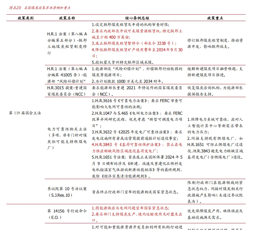 特朗普政府推出多项行政举措支持美国煤炭产业,包括宣布能源相关国家紧急状态、推动煤炭全产业链(生产、运输、使用、出口)发望、加速联邦土地煤炭租赁进程、将煤炭列为关键材料、清除行业发望障碍、保障关键发电资源留存及暂缓收紧发电厂排放标准等。