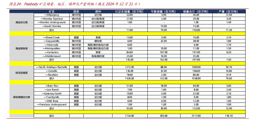 Peabody 是美国最重要的动力煤及冶金煤企业。截至 2024 年 12 月 31 日,公司在美国和澳大利亚共运营 19 个煤矿,主要包括海运动力煤、海运冶金煤、粉河盆地煤种等。合计储量 21.2 亿吨,2024 年产量 1.18 亿吨。成长性来看,公司澳大利亚昆士兰州的森图里昂煤矿开发持续推进,已实现生产与销售,长壁开采计划于 2026 年第一季度启动。