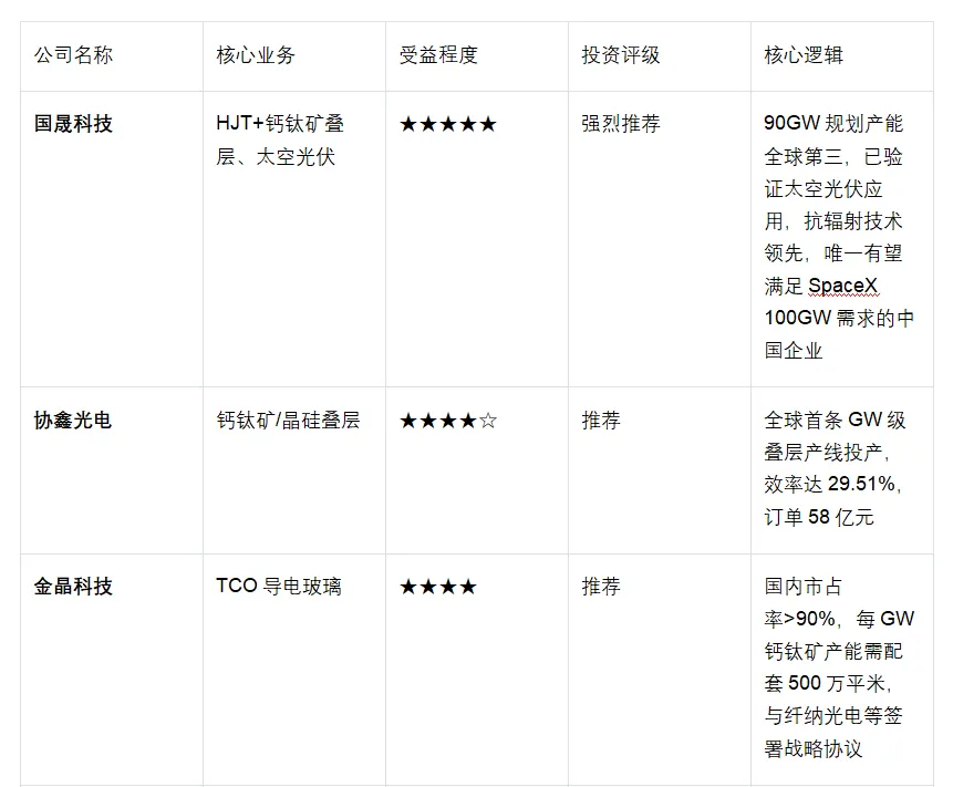 3.钙钛矿+HJT叠层技术将成为太空光伏主流路线,协鑫光电、金晶科技等企业将充分受益