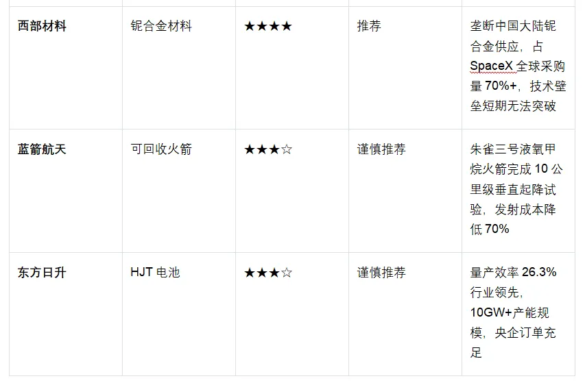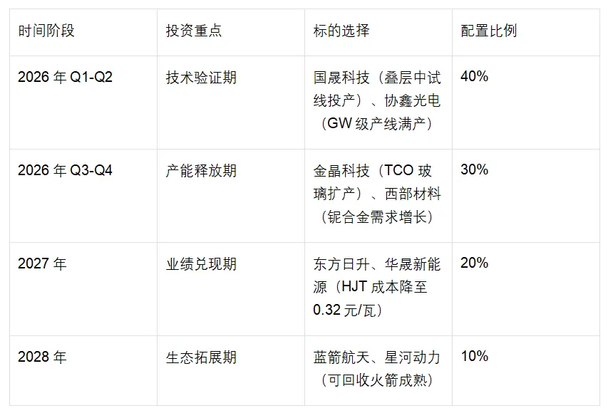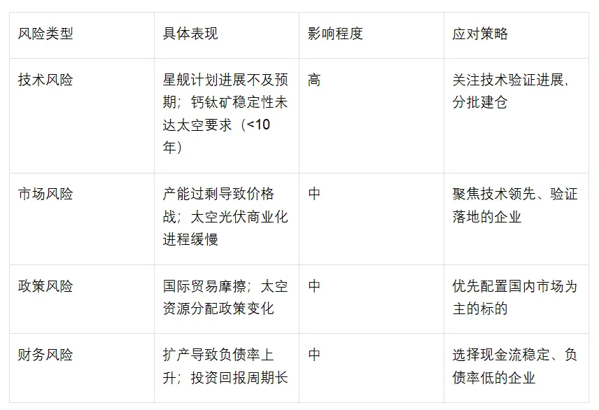 投资展望:建议重点关注国晟科技的叠层技术进展和30GW产能落地,以及协鑫光电的GW级产线满产情况,这两大事件将成为太空光伏领域的重要催化剂,有望带来超额收益。同时,密切跟踪星舰计划的发射频率提升和成本下降进度,及时调整投资组合配置。