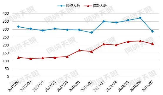 本月,网贷行业投融资人数均有所下降,借款人数为209.33万人,环比下降7.70%;投资人数为287.26人,环比下降23.01%。总体来看,投融资人数由年初上涨趋势转为下降,一定程度上显示了近期网贷行业持续走低,由于近几个月问题平台数量大增,可见部分投资人在“雷潮”中对行业信心不足,减少了投资。