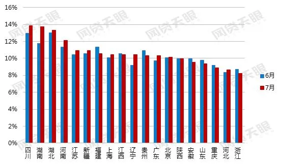 本月,网贷行业成交额下降趋势较为明显,其中,浙江降幅达18.38%,其他地区降幅多在6%-15%之间。7月30日,广州互金协会在其官网发布《广州市网络借贷信息中介机构业务退出指引(试行)》,《指引》提出了“三不可”原则,要求网贷机构退出期间,网贷机构经营地址不可搬迁、平台网站/APP不可关闭、平台股东和高级管理人员不可失联。可见在网贷行业动荡期,互金协会和监管部门都在为投资者保驾护航,大批平台的退出是排毒自清的表现,也是肃清行业的必经之路。