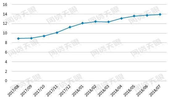 本月,网贷行业平均借款期限为13.92个月,较上月延长0.16个月,较去年7月延长5.2个月。从上图可见,期限延长趋势明显,且没有放缓迹象。借款期限的延长顺应行业发展方向。随着违规平台出局,平台自律性加强,在行业趋于良性发展的同时,未来行业期限还将继续延长。