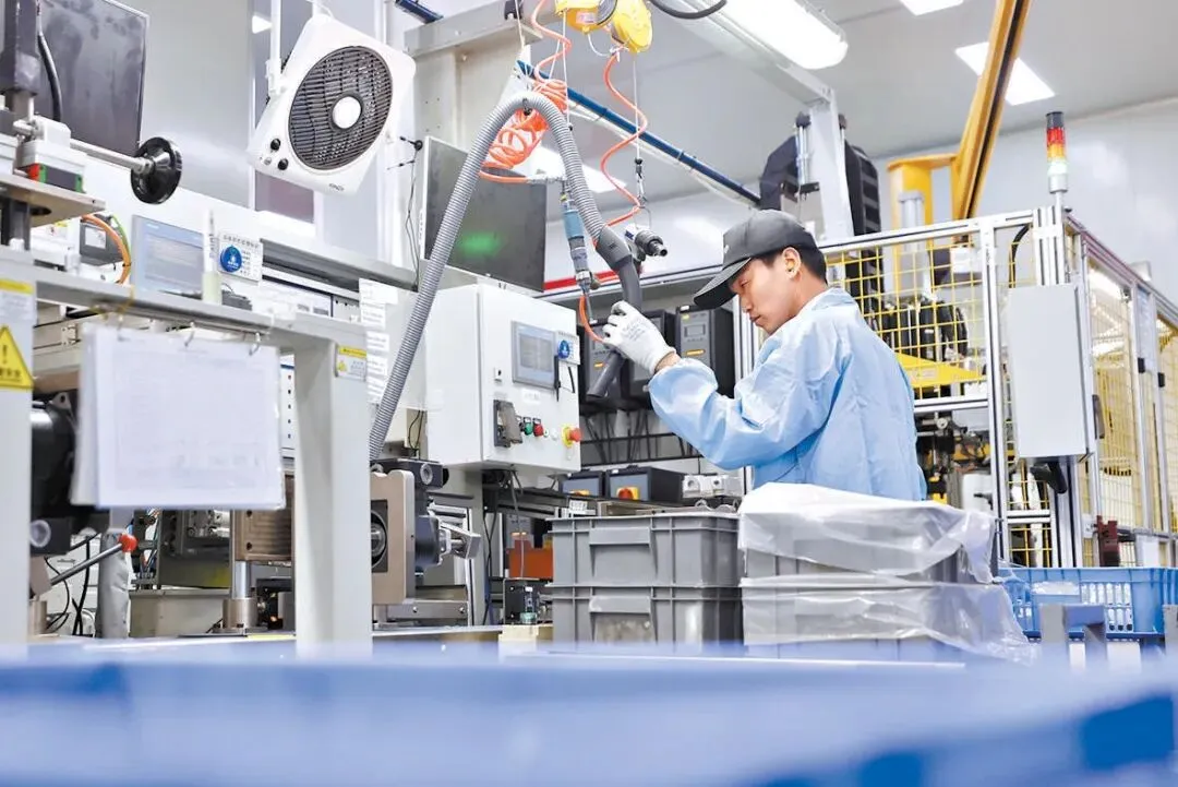 在位于廊坊市安次区的一家汽车配件企业内,工人正在生产车用空压机。贾珺摄