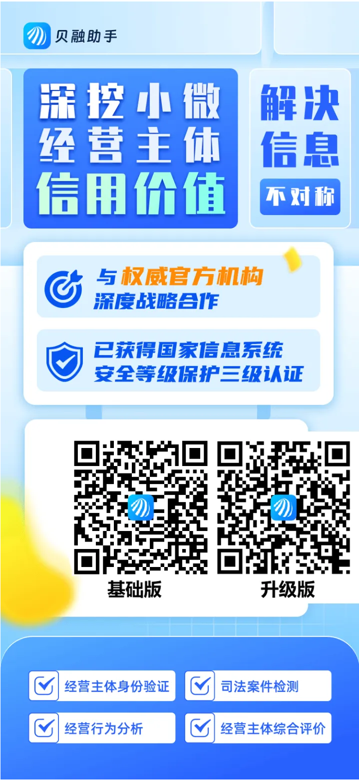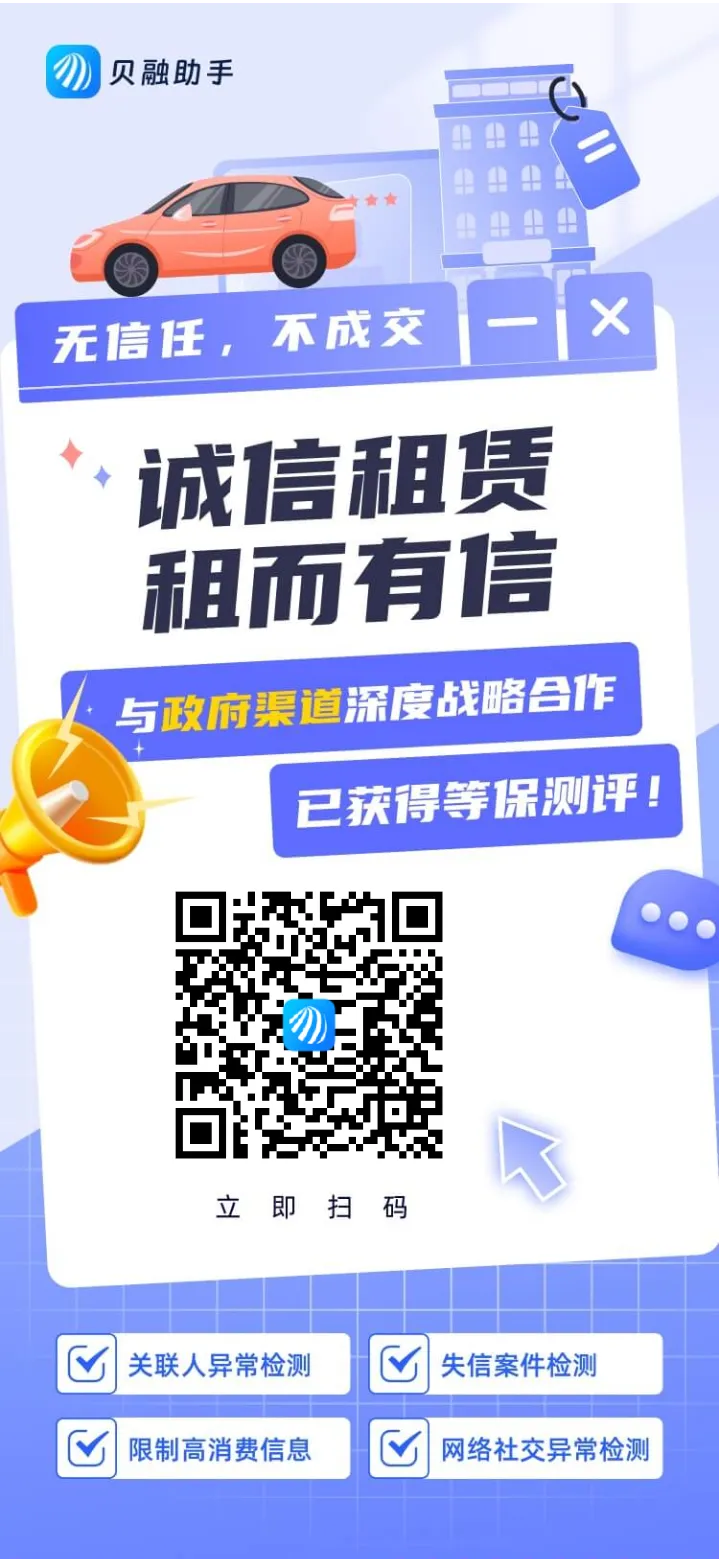 除去合同约束外,进一步调查、核实、分析,根据线上合规的尽调报告,综合评估承租方的履约能力!贝融助手2019年上线至今,与成都数据集团达成合作,与天府市民云、i淮安合作上线专属信用报告,共同打造公共数据应用新场景,被信用中国作为案例收录,用户体量已达1000万+。如果您觉得文章对您有用