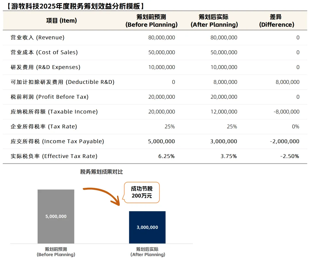 “通过上述一系列工作,我们成功为公司申请了800万元的研发费用加计扣除。从图表可以清晰看到,这使我们的应纳税所得额从2000万降至1200万,直接为公司节约了200万元的真金白银,实际税负率也从6.25%下降到了3.75%,超额完成了我们年初设定的目标。”