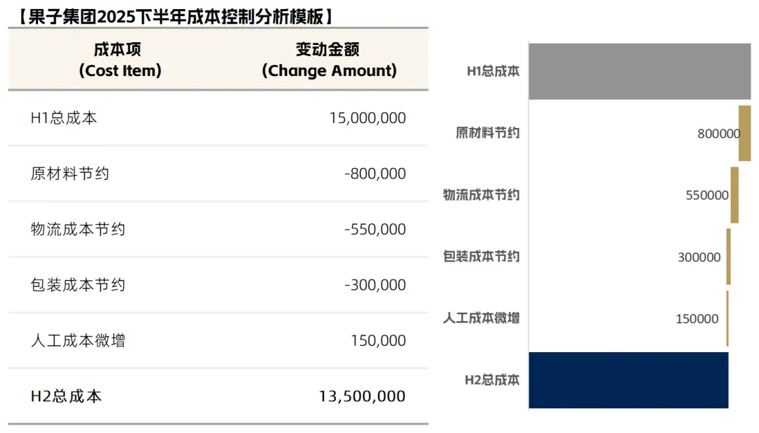 “大家可以看到这张瀑布图。我们从上半年1500万的总成本出发,通过在原材料、物流和包装三方面的努力,分别节约了80万、55万和30万。即使考虑到人工成本的正常增长,我们最终在下半年将总成本控制在了1350万,合计节约成本150万元,综合成本降幅达到了10%,为公司毛利率的回升提供了坚实的基础。”