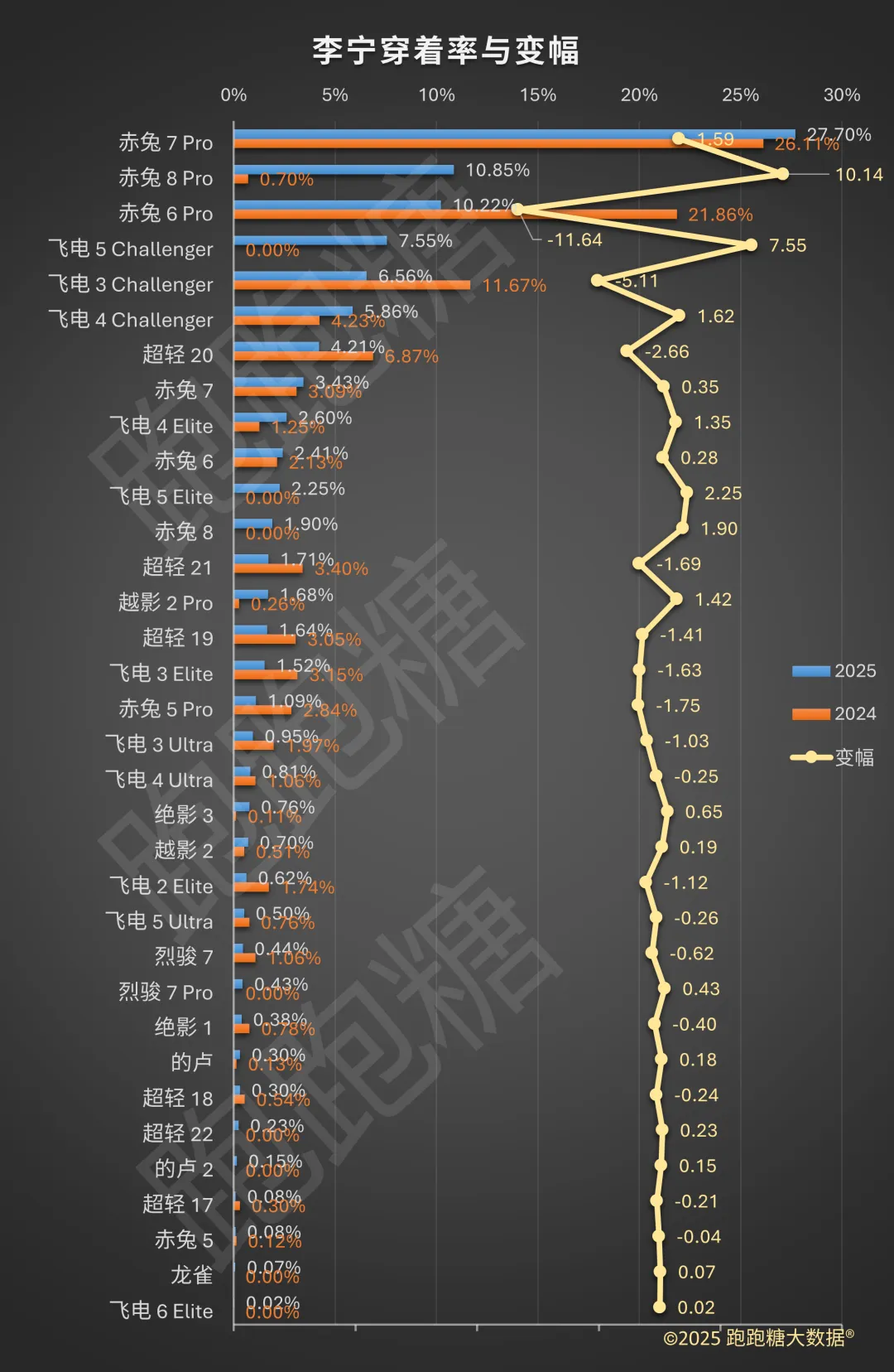 作为系列主力,赤兔7 Pro 以27.70% 的穿着率高居榜首,并保持增长。这款于2024 年上市的训练鞋,采用了全掌䨻材质中底,为大众跑者提供高回弹体验,服务于学生体育中考、严肃跑者的节奏跑及长距离训练场景,已成为该价位段的“现象级”产品,用户基本盘庞大。