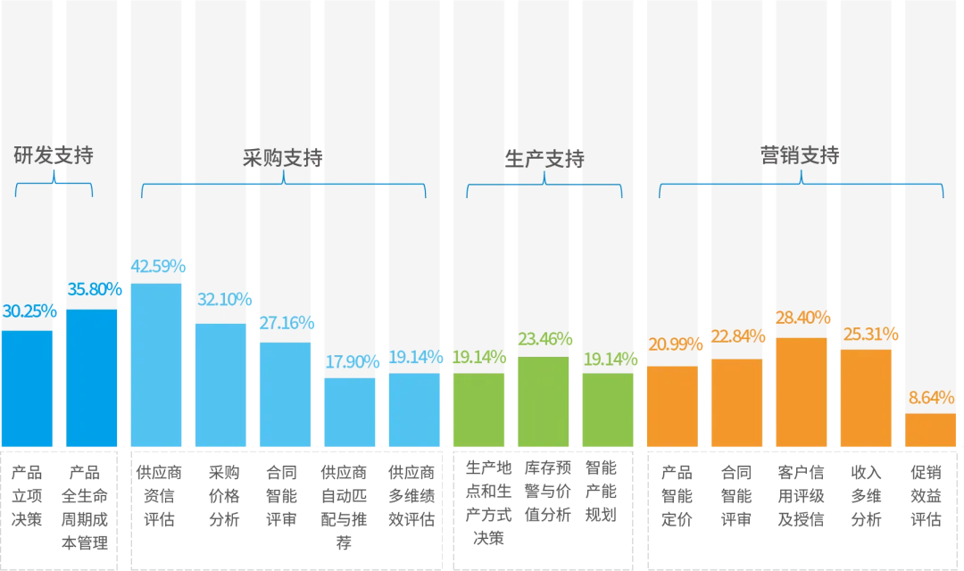调研显示,在业务支持数智化场景应用中,企业当前在研发、采购、营销支持方面的数智化实践相对集中,具体来看,应用率较多的场景包括:供应商资信评估(42.59%)、产品全生命周期成本管理(35.80%)、采购价格分析(32.10%)、产品立项决策(30.25%)和客户信用评级及授信(28.40%)。这一结果反映,财务在供应链与产品管理等关键业务环节中,已逐步提供数智化能力支持,但整体应用率不高,说明财务在业务前端的数智化赋能尚处于早期探索阶段。