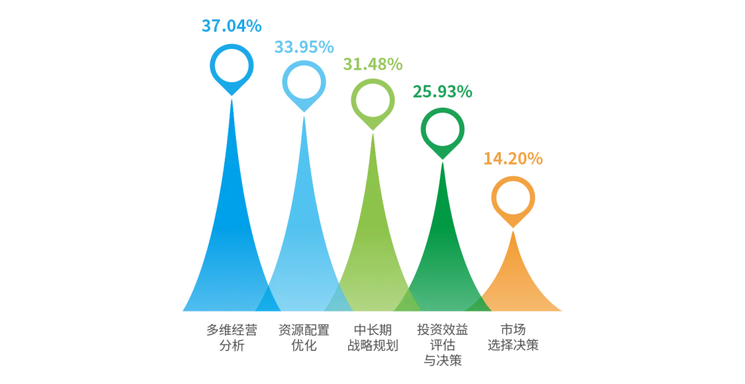 调研显示,在决策支持数智化场景应用中,多维经营分析(37.04%)与资源配置优化(33.95%)应用率相对较高,说明企业优先聚焦内部经营分析和资源配置优化;而市场选择决策(14.20%)及投资效益评估与决策(25.93%)应用率相对偏低,说明当前企业在应对外部不确定性、构建前瞻性决策能力方面仍面临困难,原因或在于外部数据获取不充分、投资评估与市场进入的量化分析体系尚未成熟。