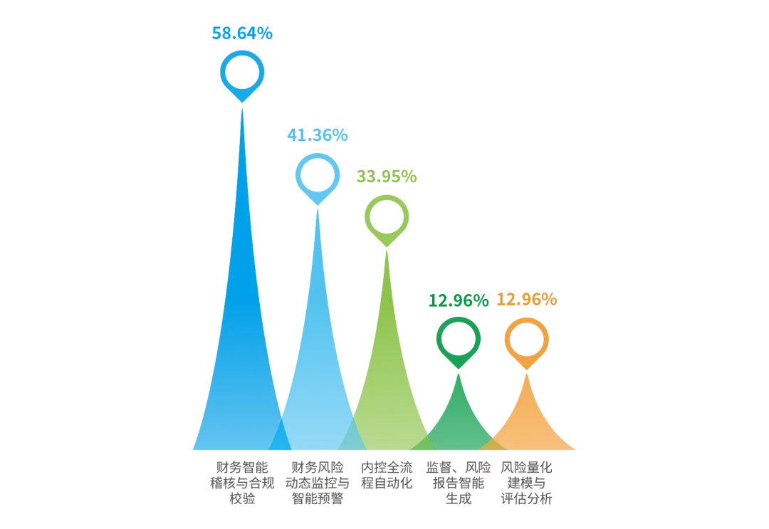 调研显示,在风险内控数智化场景应用中,财务智能稽核与合规校验(58.64%)是应用率最高的场景,反映出企业当前以满足监管要求、提升内控效率为主要着力点;其次是财务风险动态监控与智能预警(41.36%),说明部分企业已开始构建事中风险监测能力;监督、风险报告智能生成(12.96%)及风险量化建模与评估分析(12.96%)应用偏低,说明企业在人工智能与复杂模型方面的应用能力有待提升。