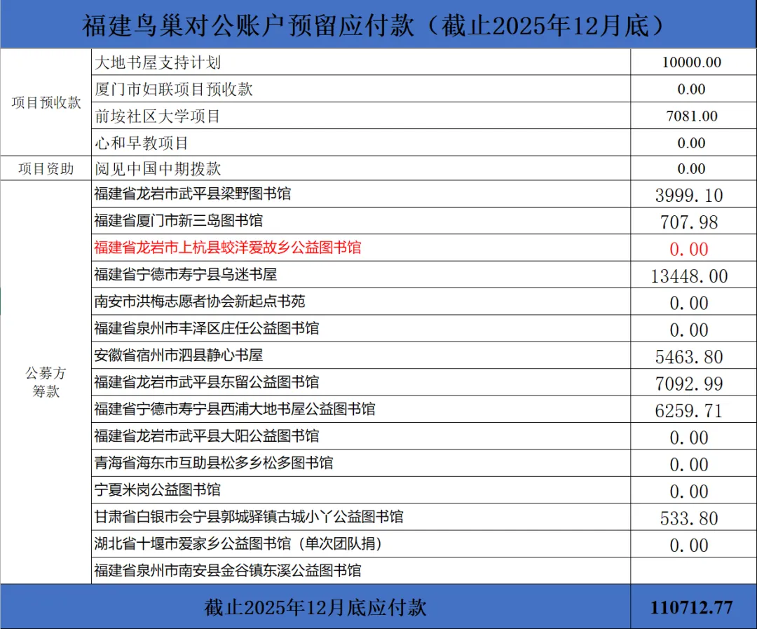 福建省鸟巢助学公益服务中心(鸟巢计划),在此向社会公众公开2025年12月财务报告及收支明细表,敬请社会各界予以审核监督。我们衷心感谢每一位关注和支持公益事业的朋友,并诚挚欢迎大家对我们的财务工作提出宝贵意见和建议。