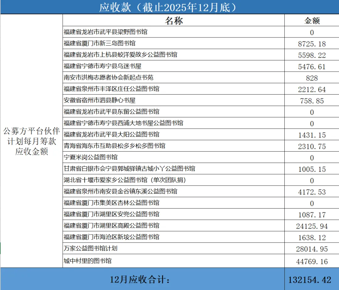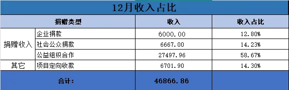 2025年12月对公账户收入合计69238.18元,其中,企业捐款44500元,占总收入64.27%;社会公众捐款1601元,占总收入2.31%;公益组织合作捐款收入22915元,占收入33.1.67%;项目定向收款222.18元,占收入0.32%。为了维持机构正常运营,本月向理事长丁勇借款到账6万元。