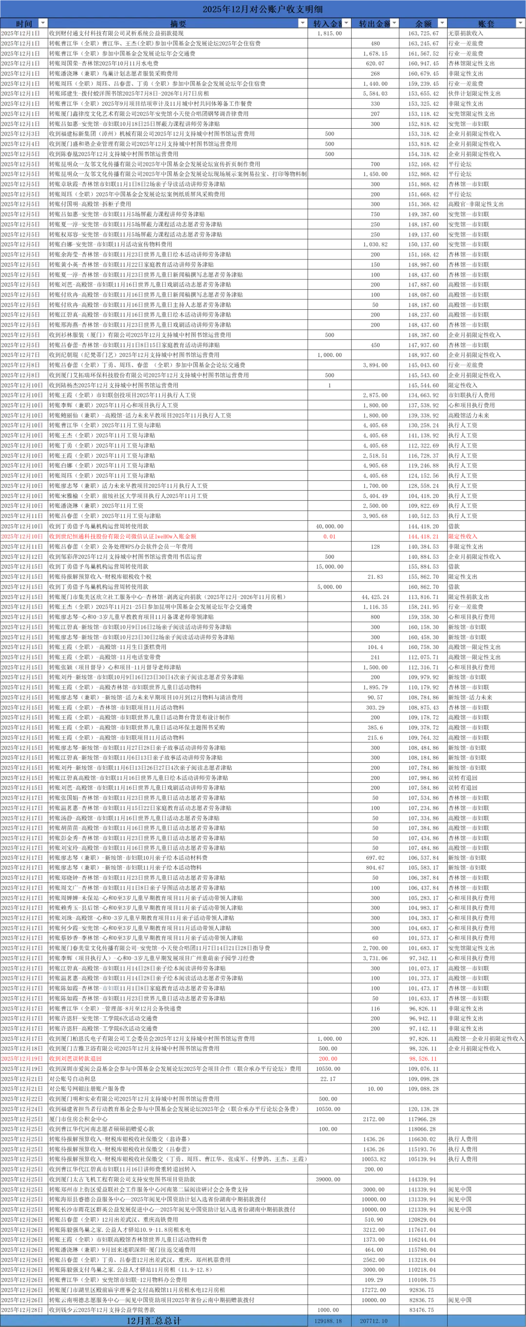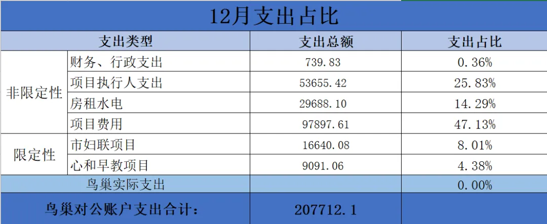 2025年12月对公账户总支出合计207712.1元。非限定性支出:财务行政支出739.83元,占总支出0.36%;项目执行人支出53655.42元,占总支出25.83%;项目费用97897.61元,占总支出47.13%;房租水电29688.1元,占总支出14.29%。限定性支出:市妇联项目12月支出16640.08元,占总支出8.01%;心和早教项目12月支出9091.06元,占限定性总支出4.38%。
