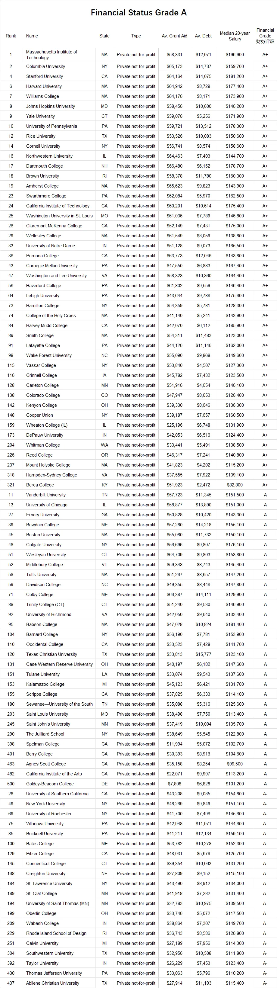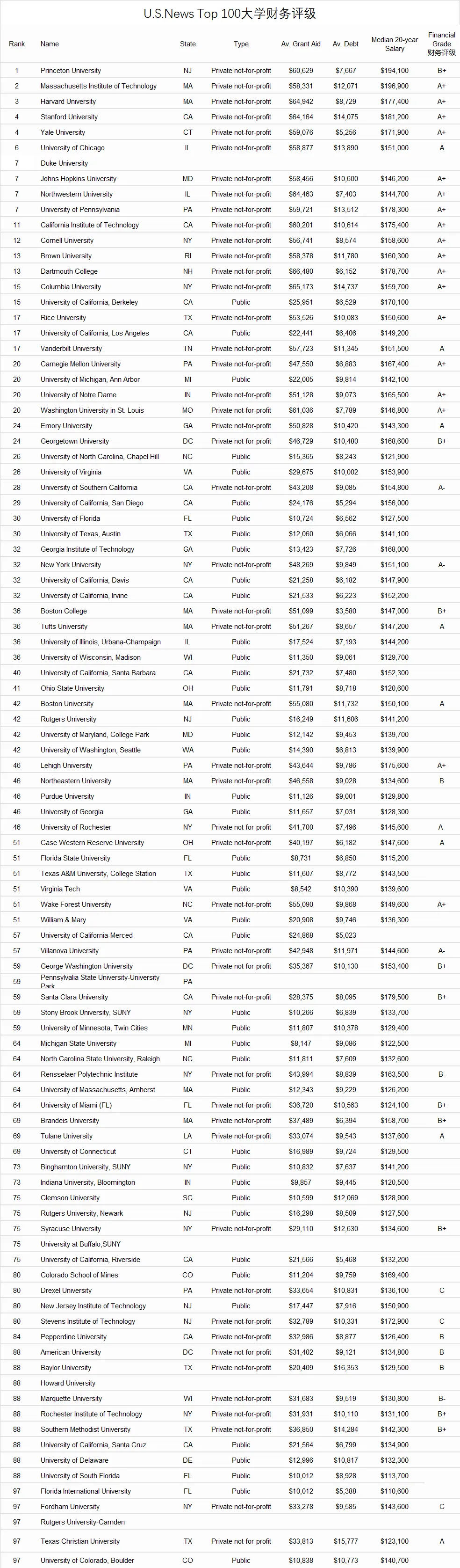 此外,也有一些规模不大但财务稳健的学院上榜,如库伯联盟学院、新英格兰音乐学院等。总体而言,财务实力雄厚的大学不仅能提供更优质的教育资源与奖学金支持,其校友网络与长期发展也往往更为稳固。对于留学家庭来说,在择校过程中多维度评估学校的可持续性,或许能避免未来不必要的风险。U.S.News 美国前100大学福布斯财务评级