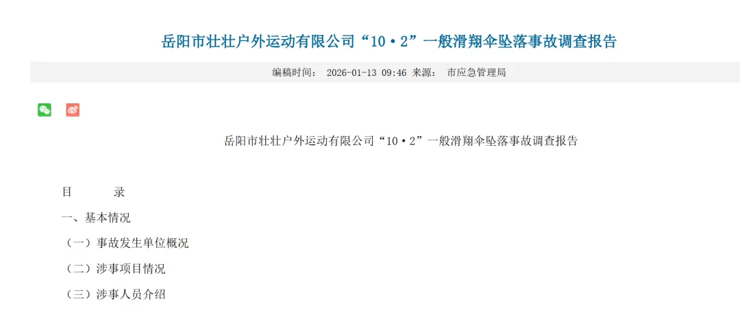 调查认定:岳阳市壮壮户外运动有限公司“10·2”一般滑翔伞坠落事故是一起新兴体育项目经营过程中,因涉事企业安全生产主体责任落实不力、从业人员管理失控、安全操作流程未执行,属地及行业部门监管责任落实不到位、跨区域协同监管缺失而导致的一般生产安全责任事故。