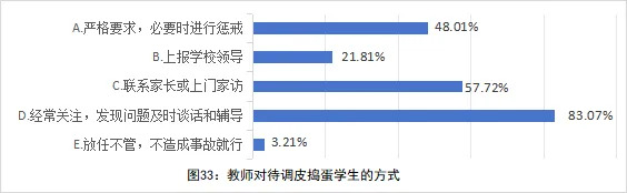 教师教育教学中面对“问题生”的实际问题,采取积极干预、家校协同等方式为主。对于调皮捣蛋、不守纪律或不爱学习的学生,83.07%的教师选择“经常关注,发现问题及时谈话和辅导”。这体现出多数教师秉持积极主动的教育态度,比较关注学生动态。57.72%的教师会选择“联系家长或上门家访”。表明超半数教师重视家校合作,认识到家庭在学生成长中的关键作用,通过协同制定教育策略,形成家校育人合力(见图33)。
