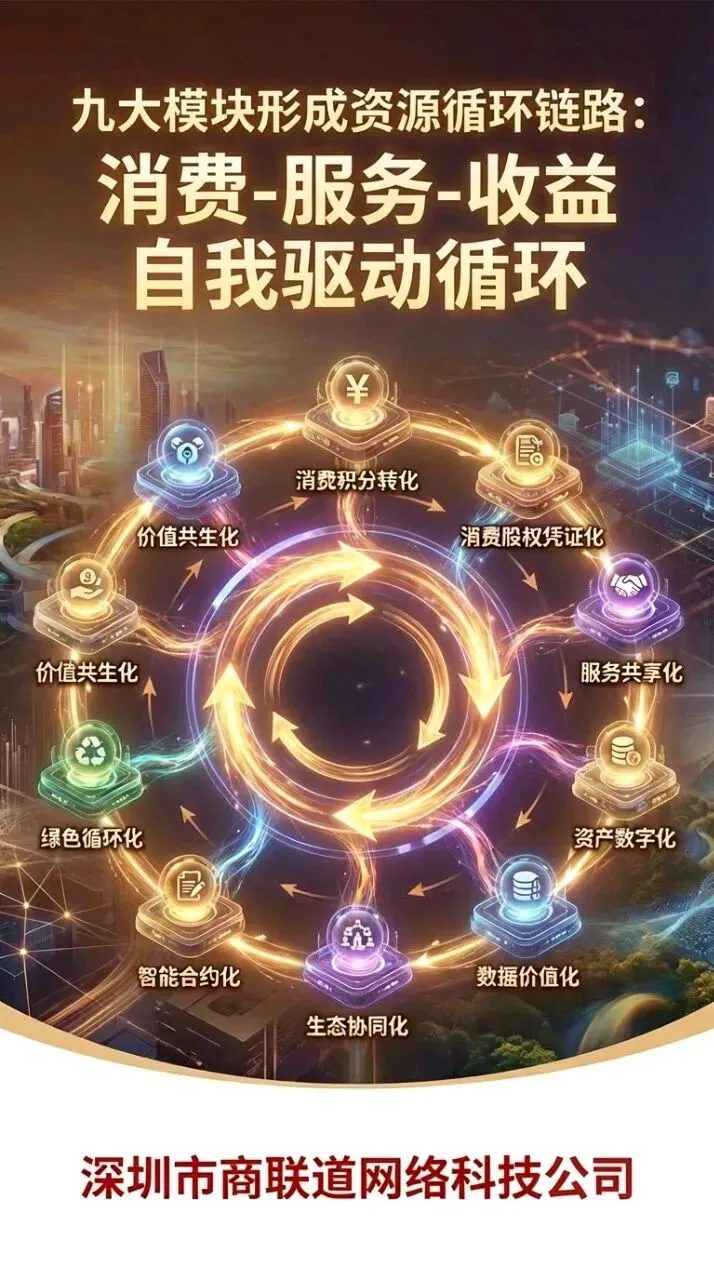 ☆ 闭环生态构建者:以“九大模块”形成资源循环链路(如消费积分转化、消费股权凭证化、服务共享化),实现“消费-服务-收益”的自我驱动循环。