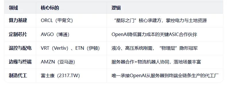 如果说台积电代表算力的“供给侧”,那么OpenAI的最新动作,则标志着AI正加速走向“应用侧”与“实体化”。联合甲骨文,在美国本土建设下一代AI数据中心,重点解决电力供应与芯片散热两大瓶颈。不再满足于算法实验,而是要打造可进入工厂、家庭的通用智能劳动力。由苹果前首席设计师Jony Ive主导,主打无屏幕、实时语音交互,定位为用户的“随身AI协作伙伴”,富士康已确认为独家代工方。AI产业链投资地图:谁是真正的“卖铲人”?