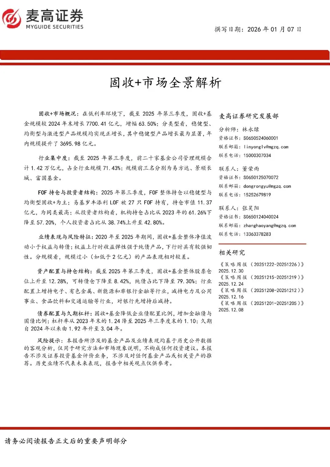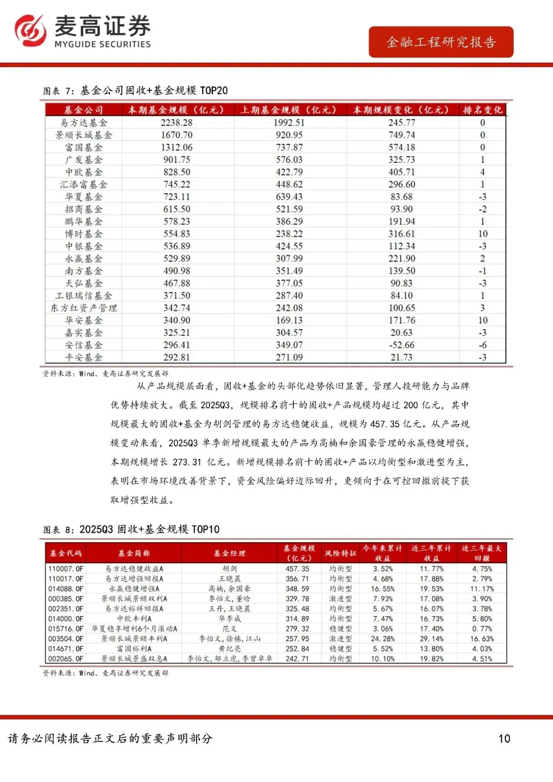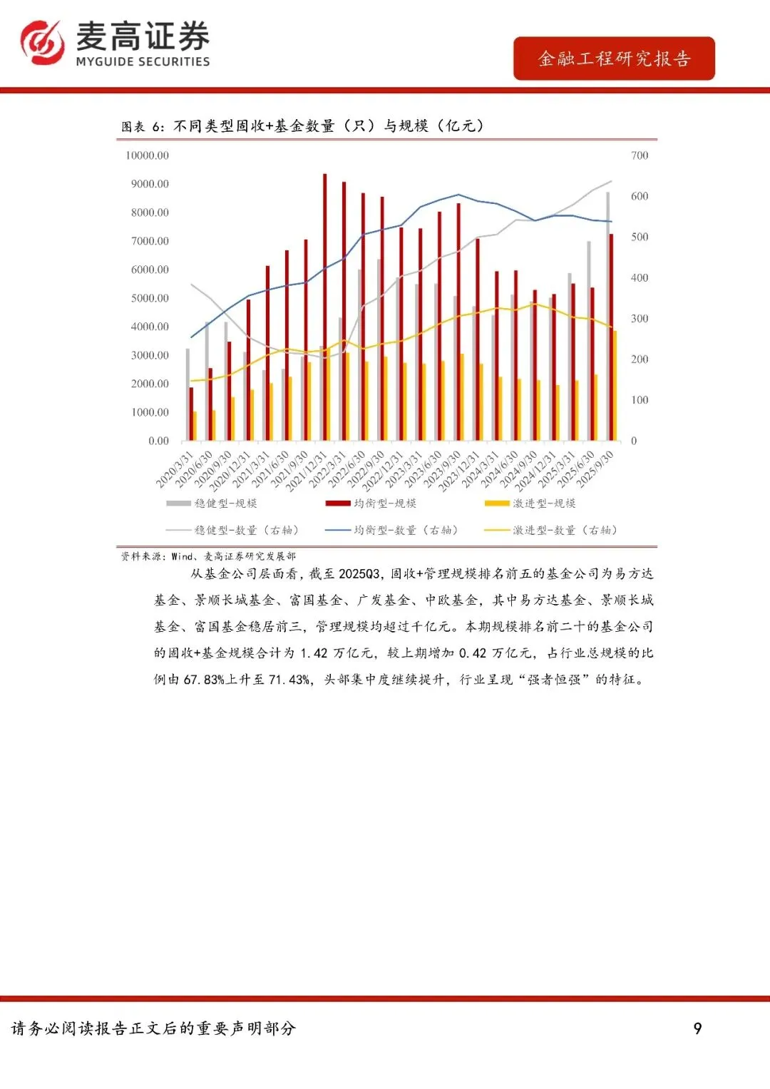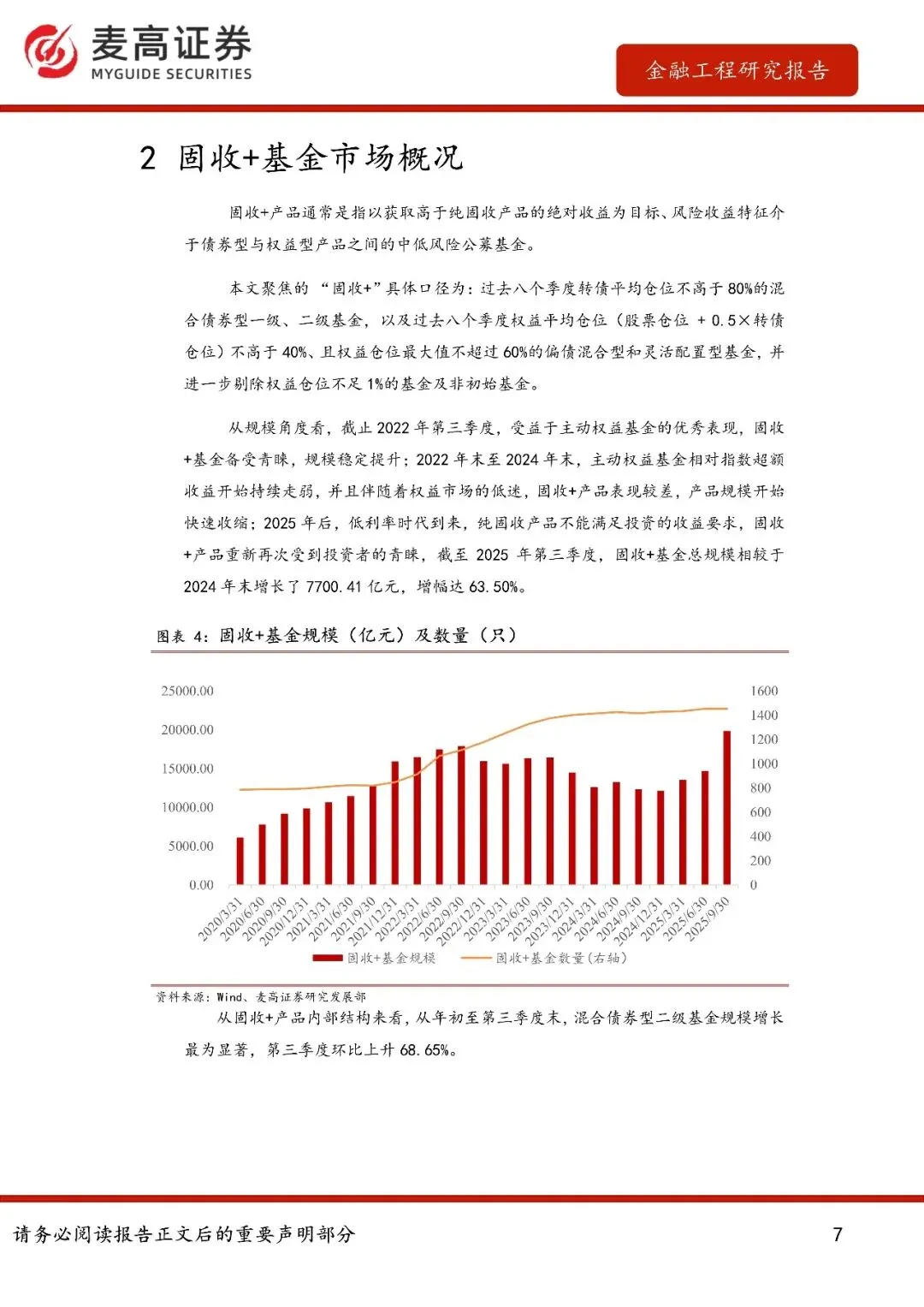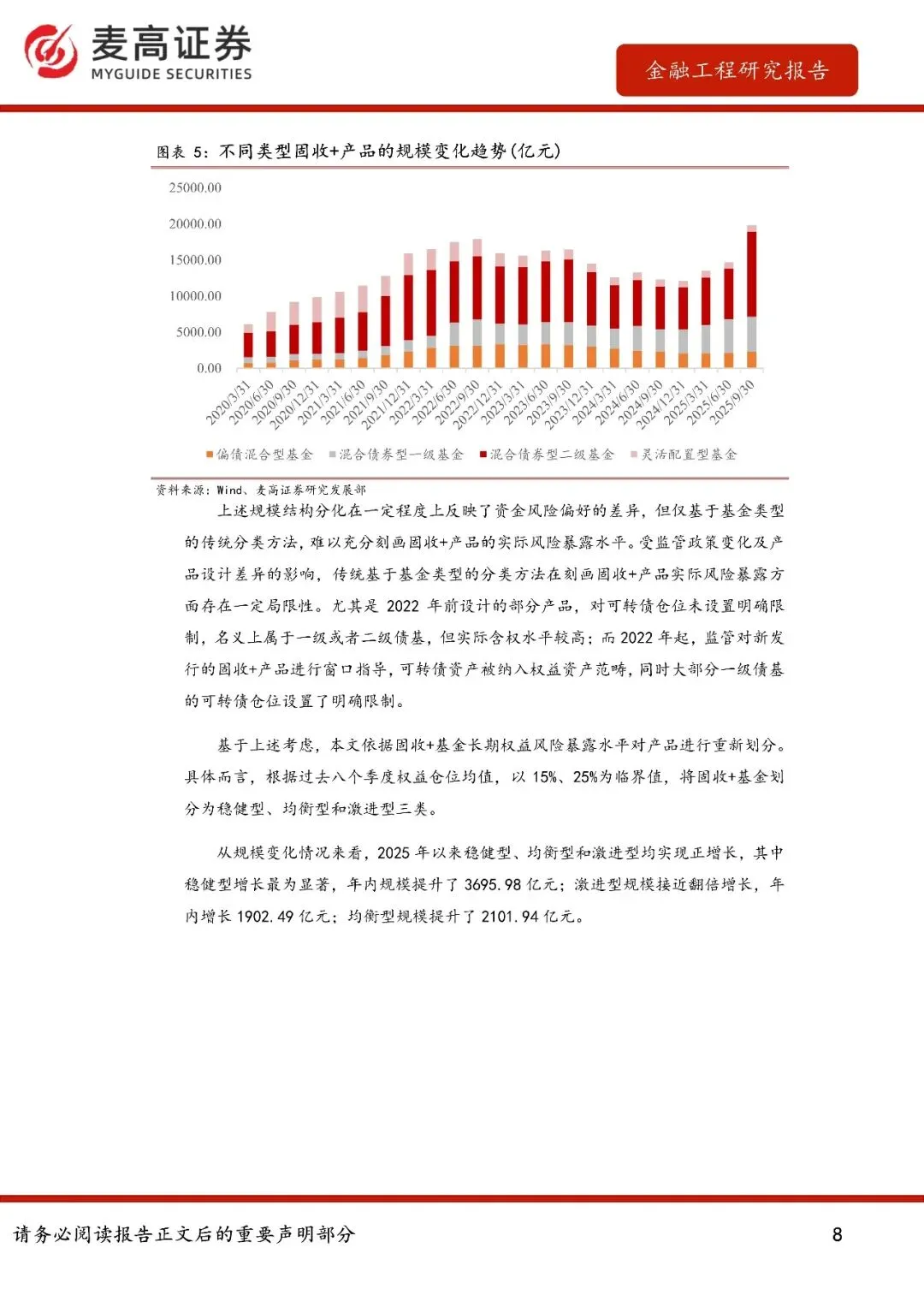 固收+市场概况:在低利率环境下,截至 2025 年第三季度,固收+基金规模较 2024 年末增长 7700.41 亿元,增幅 63.50%;分类型看,稳健型、均衡型与激进型产品规模均实现正增长,其中稳健型产品增长最为显著,年内规模提升了 3695.98 亿元。