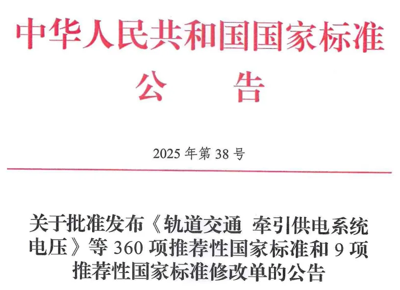 国家市场监督管理总局(国家标准化管理委员会)批准《轨道交通 牵引供电系统电压》等360项推荐性国家标准和9项推荐性国家标准修改单,现予以公告。